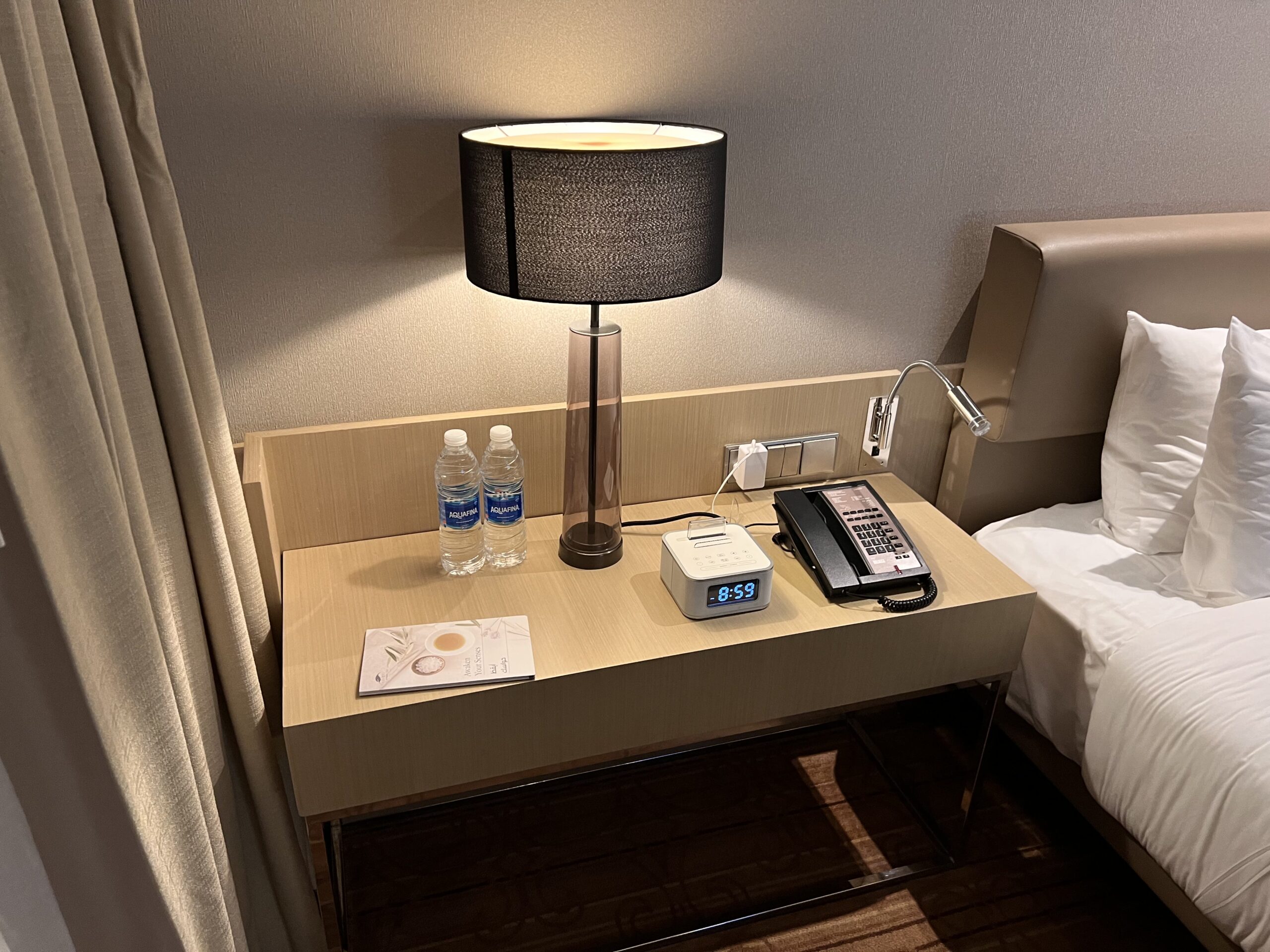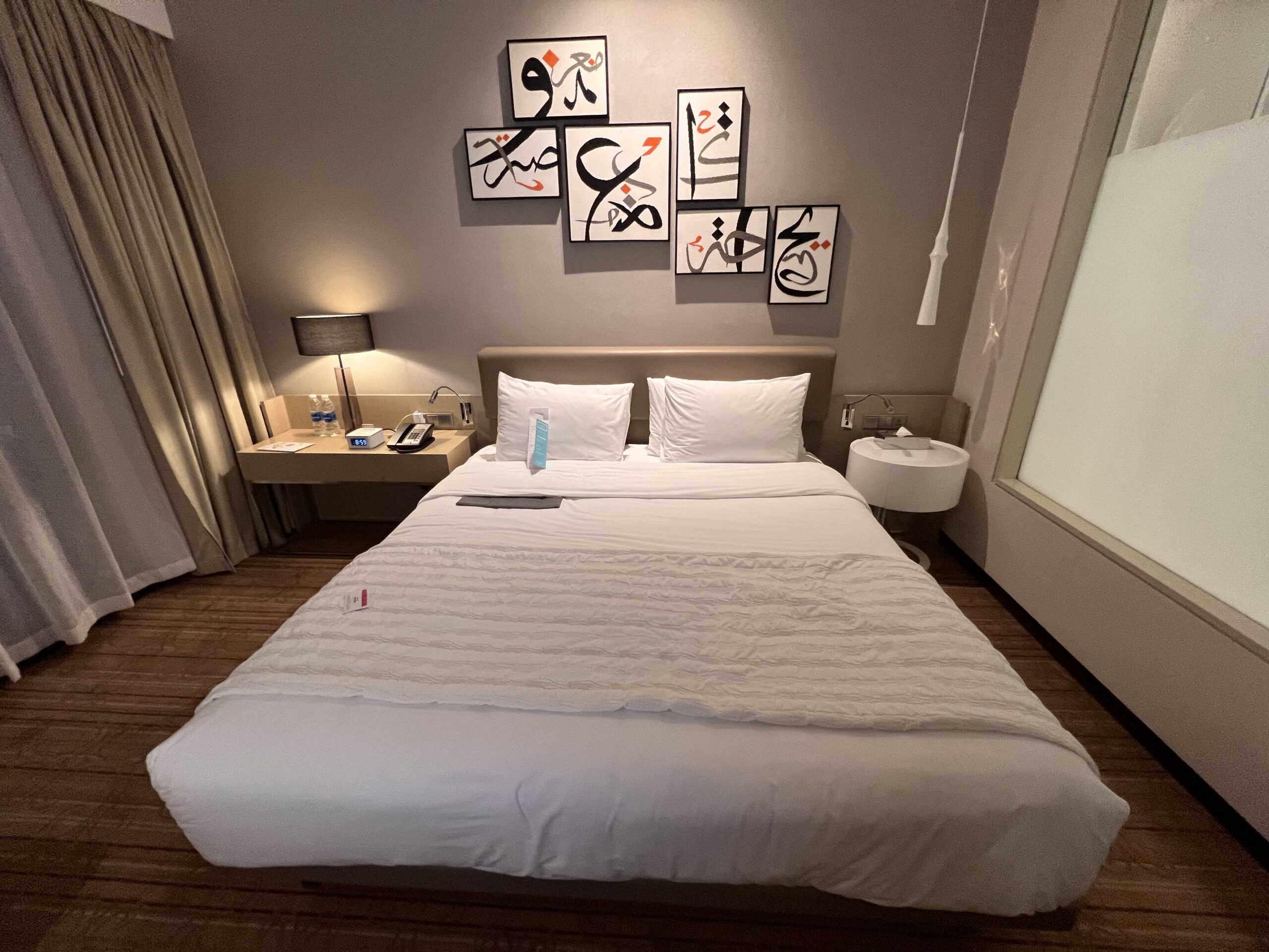 At the heart of the room is the firm King-sized bed which, paired with the Arctic-level air conditioning, meant I slept extremely well during this short visit. While this is a chain hotel, I liked the small touches that made the room feel less bare – such as the Arabic calligraphy on the wall.