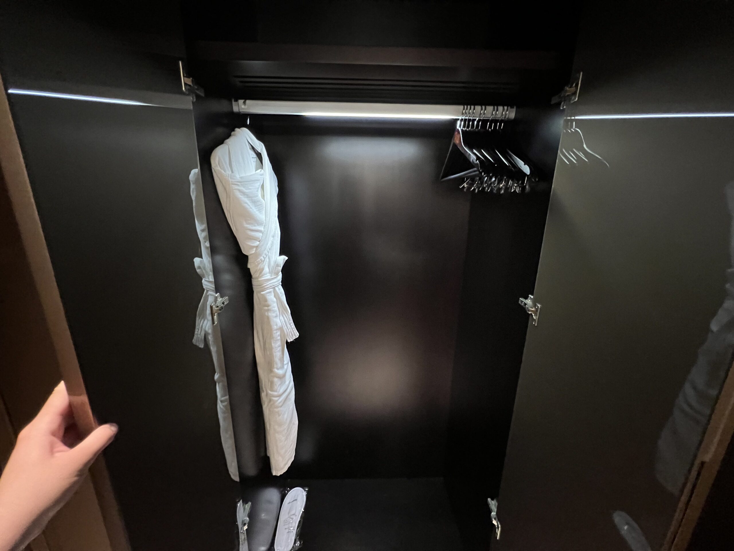 Large wardrobe space with plenty of room for 4-5 days worth of clothes can be found near the entrance. Each room comes with a iron and ironing board.