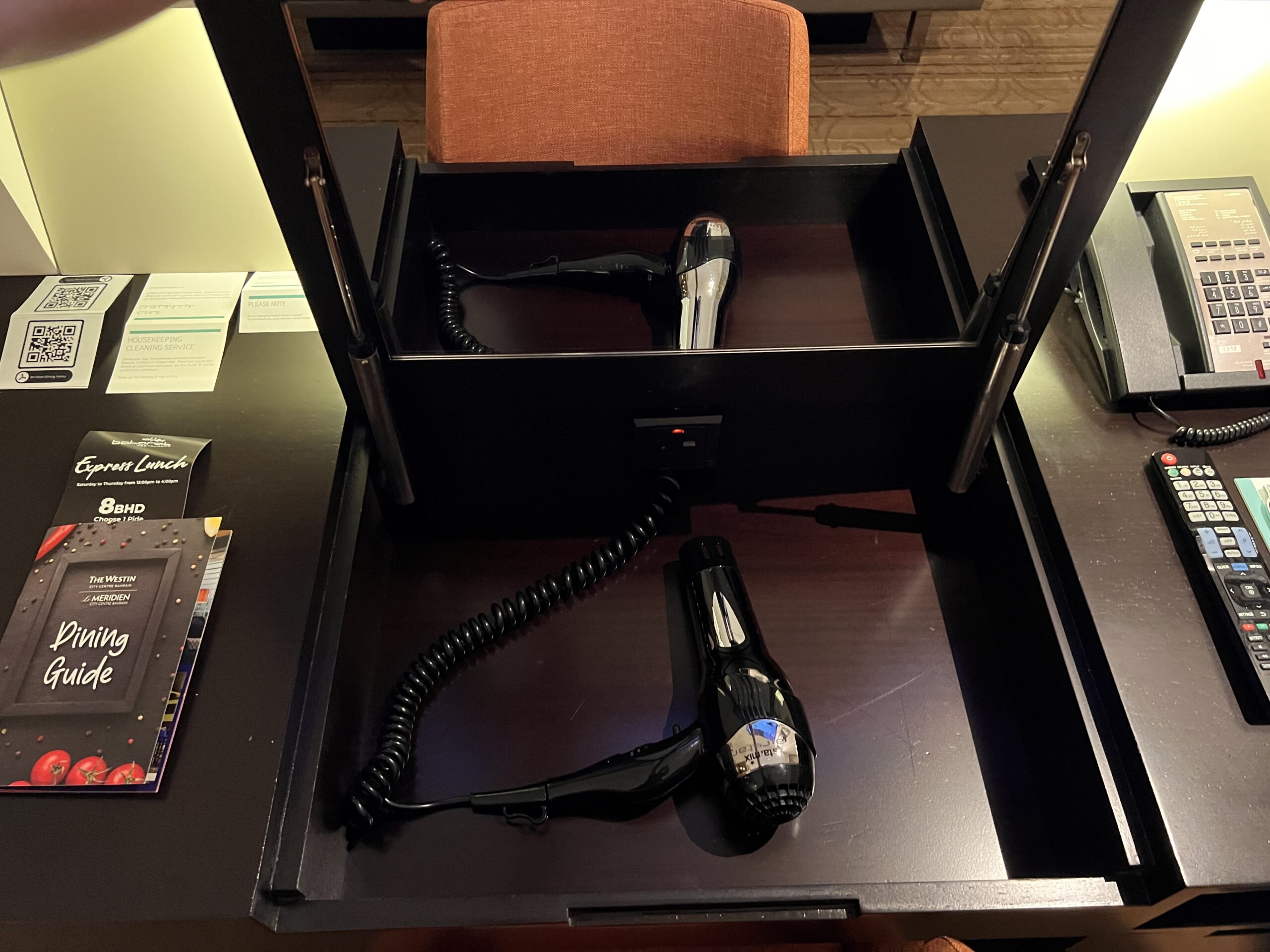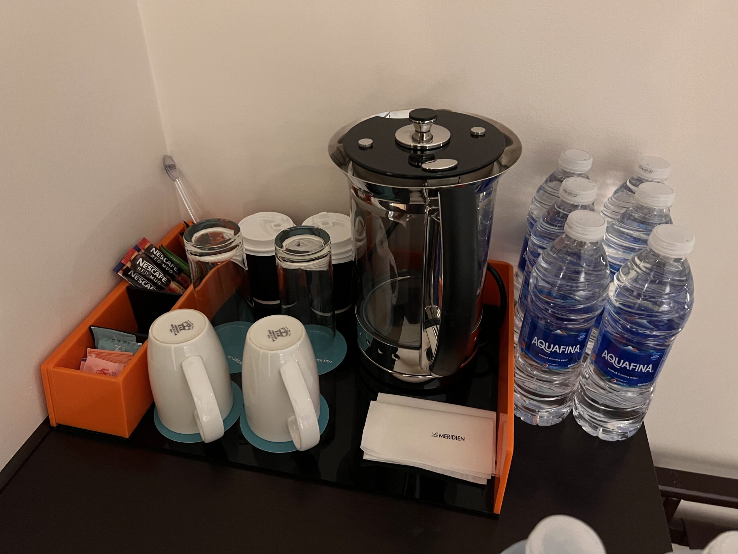 Plenty of bottled water is provided by the hotel without extra charge, which is always welcome in a country where tap water is not recommended for consumption. The hotel provided a basket of fruit and some biscuits for this stay, which was probably as a result of my Marriott Gold status which I held at the time of stay. While Nespresso can be of variable quality, that wasn’t to be found here with Nescafe sachets available instead – a bit of a disappointment for a hotel that is the mid-range category. Le Meridien do provide a complimentary one-off barista-made coffee as part of stays, which does make up for this somewhat.