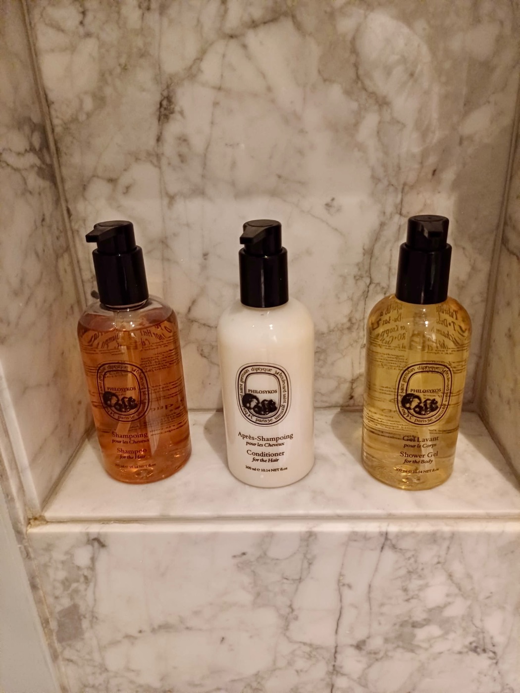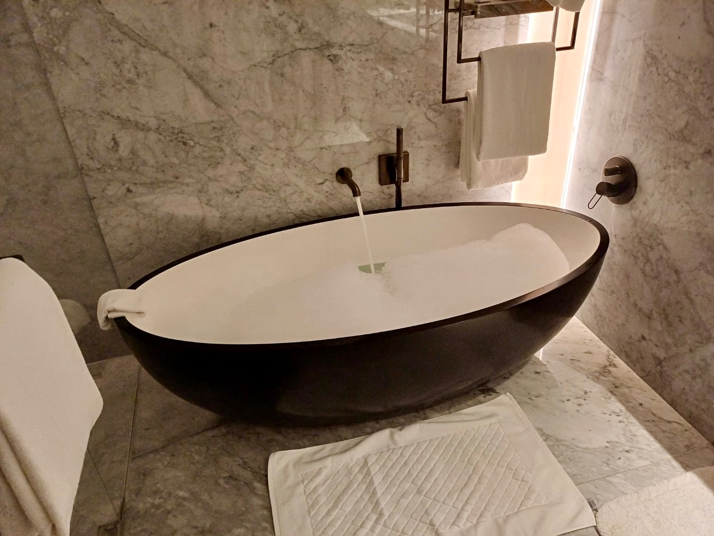 The free-standing tub, high-end Axor fittings, and the full-size Philosykos toiletries (which according