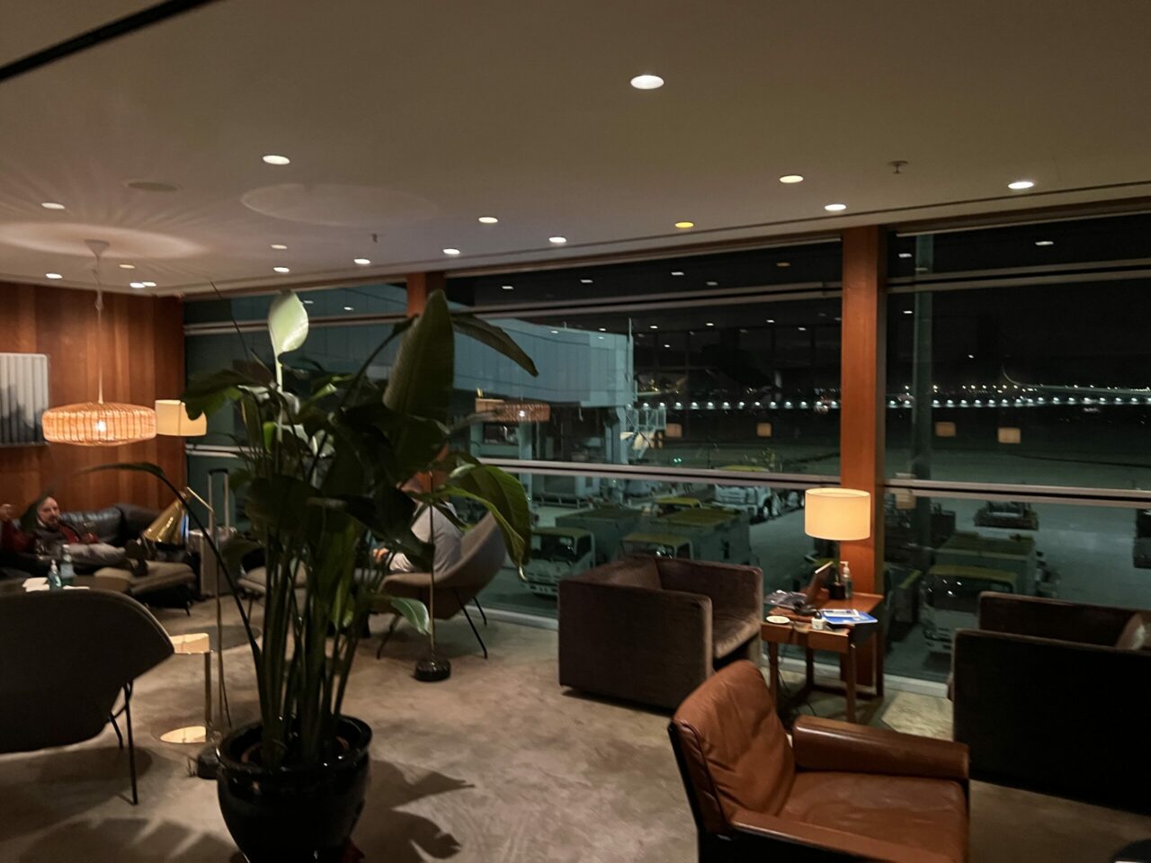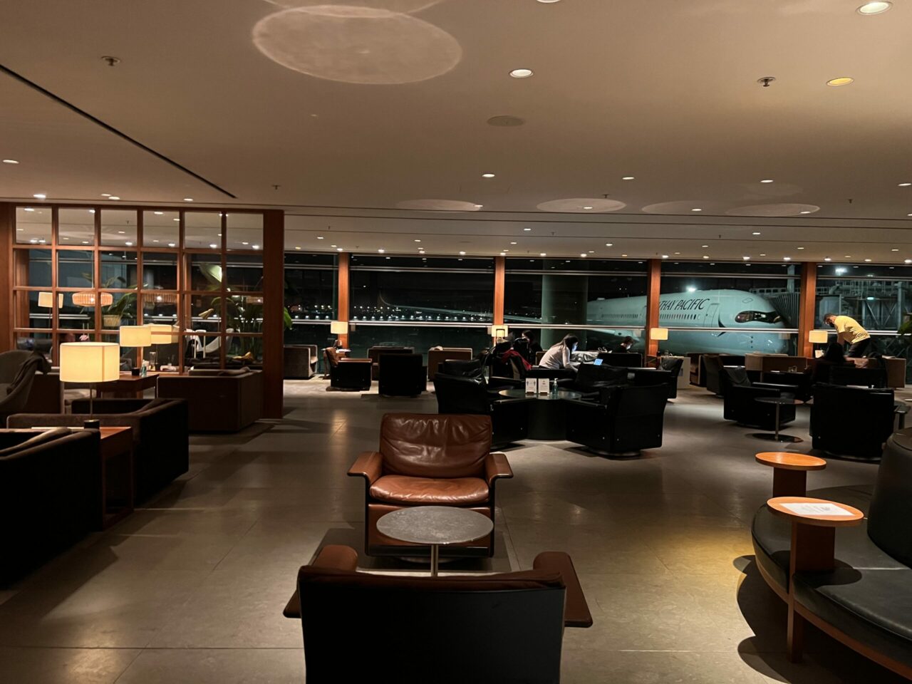 While the views were not well lit considering the dark hours, they do provide sweeping and stunning views from end of the lounge to the other – making for great avgeek pictures of the Cathay Pacific aircraft.  Along this window expanse there is plentiful options for relaxed sofa or lounger seating. Even though this lounge serves as the only option for international transits, the space never felt crowded.