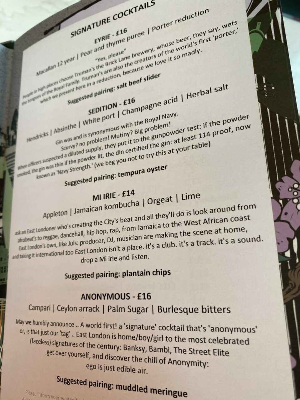 The staff member serving us was incredibly knowledgeable and went through the ingredients of each drink. There’s a wide range of cocktails, especially paired gin and tonic combinations and even a Negroni menu which I have not seen before. She also gave us a little taste of a couple of things too such as Discarded’s amazing Banana Peel rum which I highly recommend!