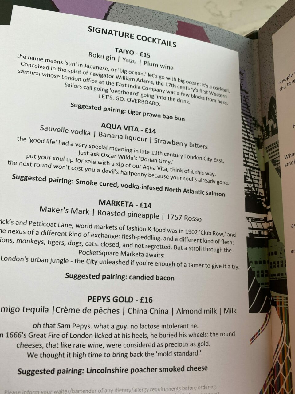 Here you will also find another fantastic mural by Spanish-born street artist Jay Kaes (IG @jaycaes) which is inspired by the urban landscape around the hotel and of course the London Underground. I really liked this one and the way the furniture blended in seamlessly with it. Jay’s artwork can also be seen on the menu for Pocketsquare.