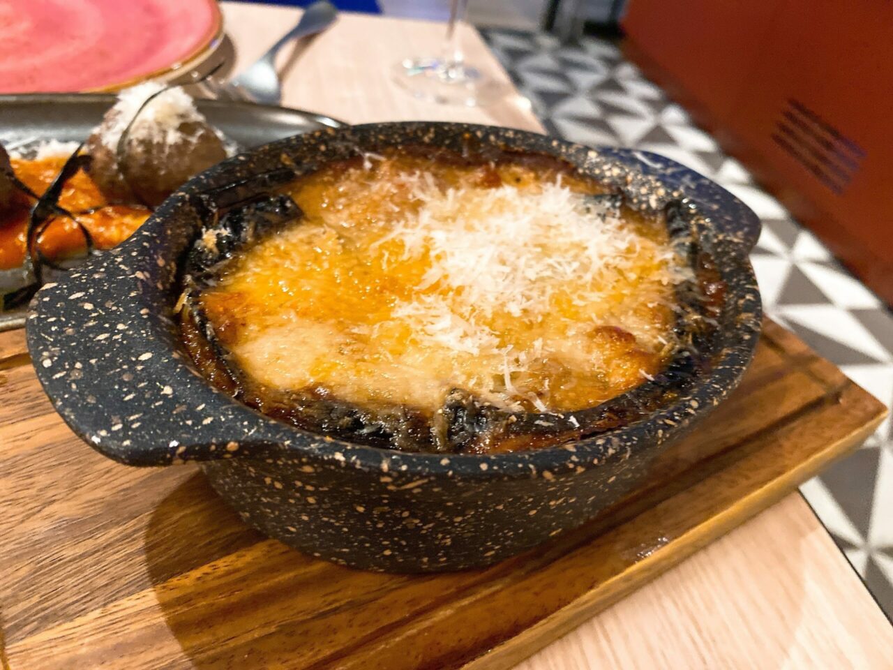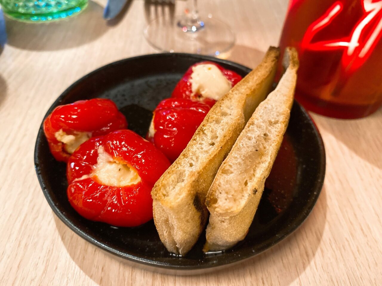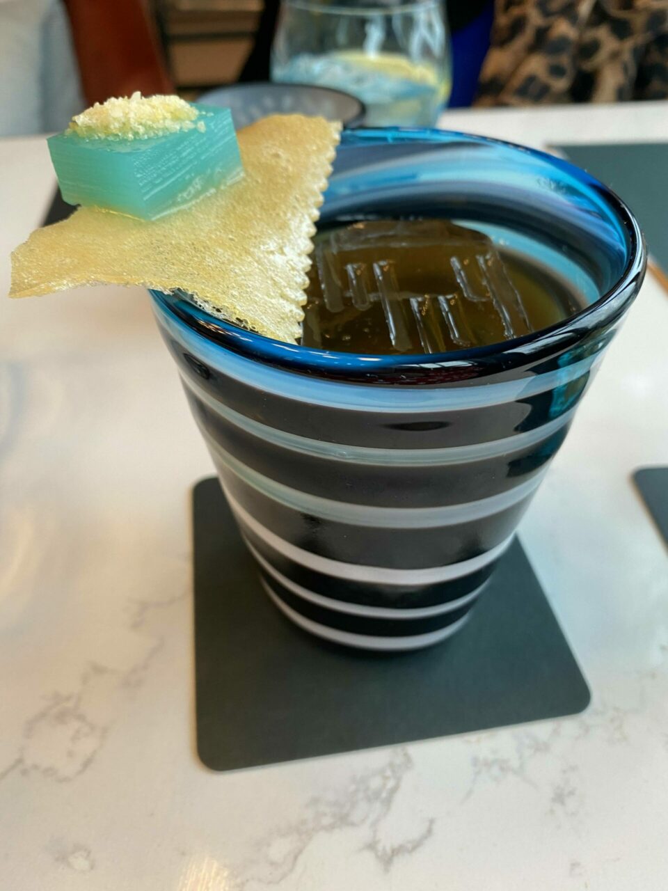 The glasses were quirky glass versions of what looked like a paper cup and hand blown. Mine came with a marinated pineapple garnish – there’s plenty of attention to detail here! Cocktails were definitely generous on the measures too – two of these and we were both feeling good!