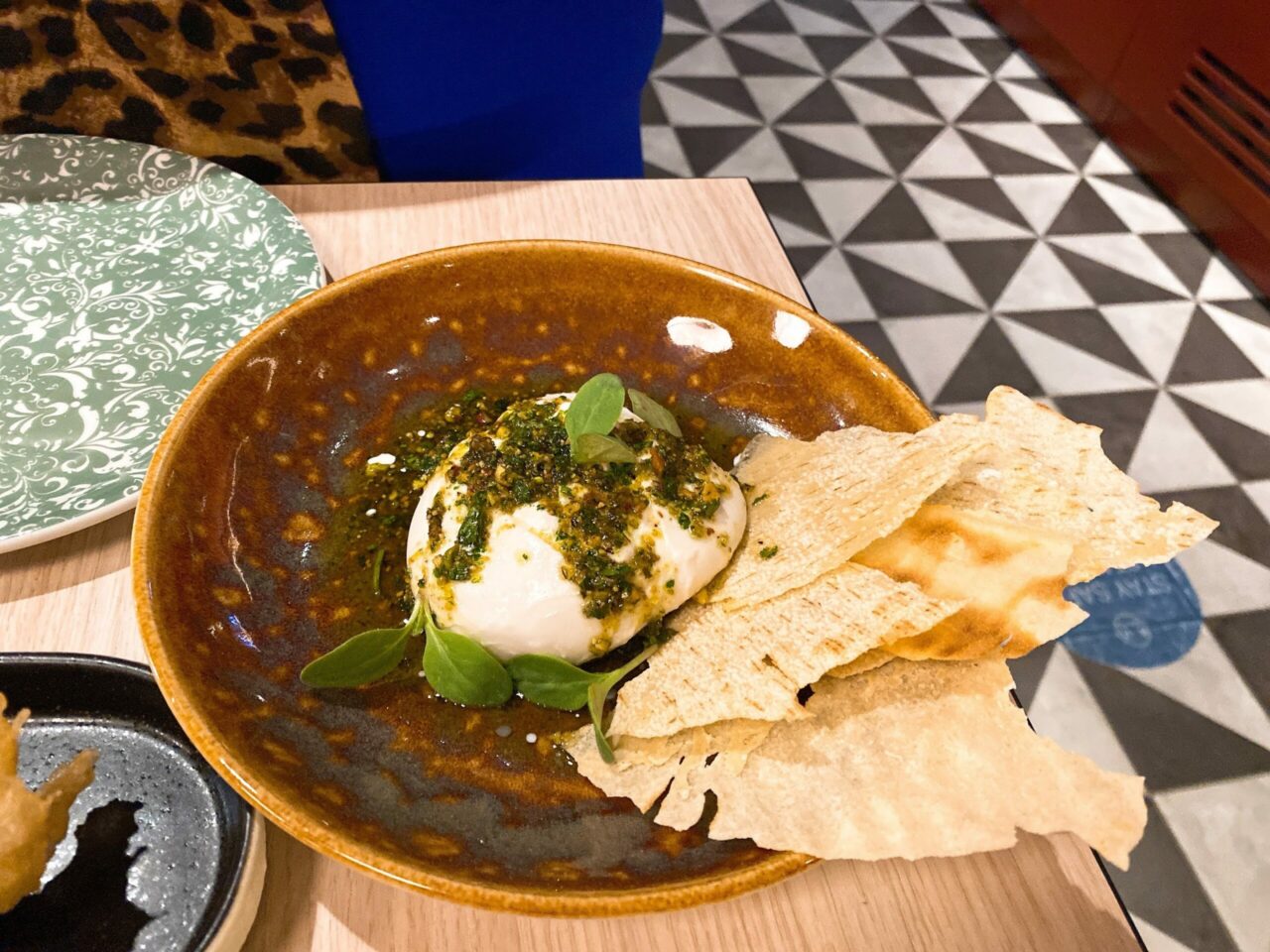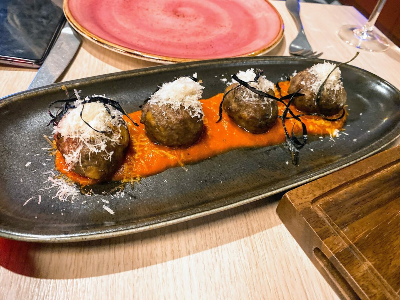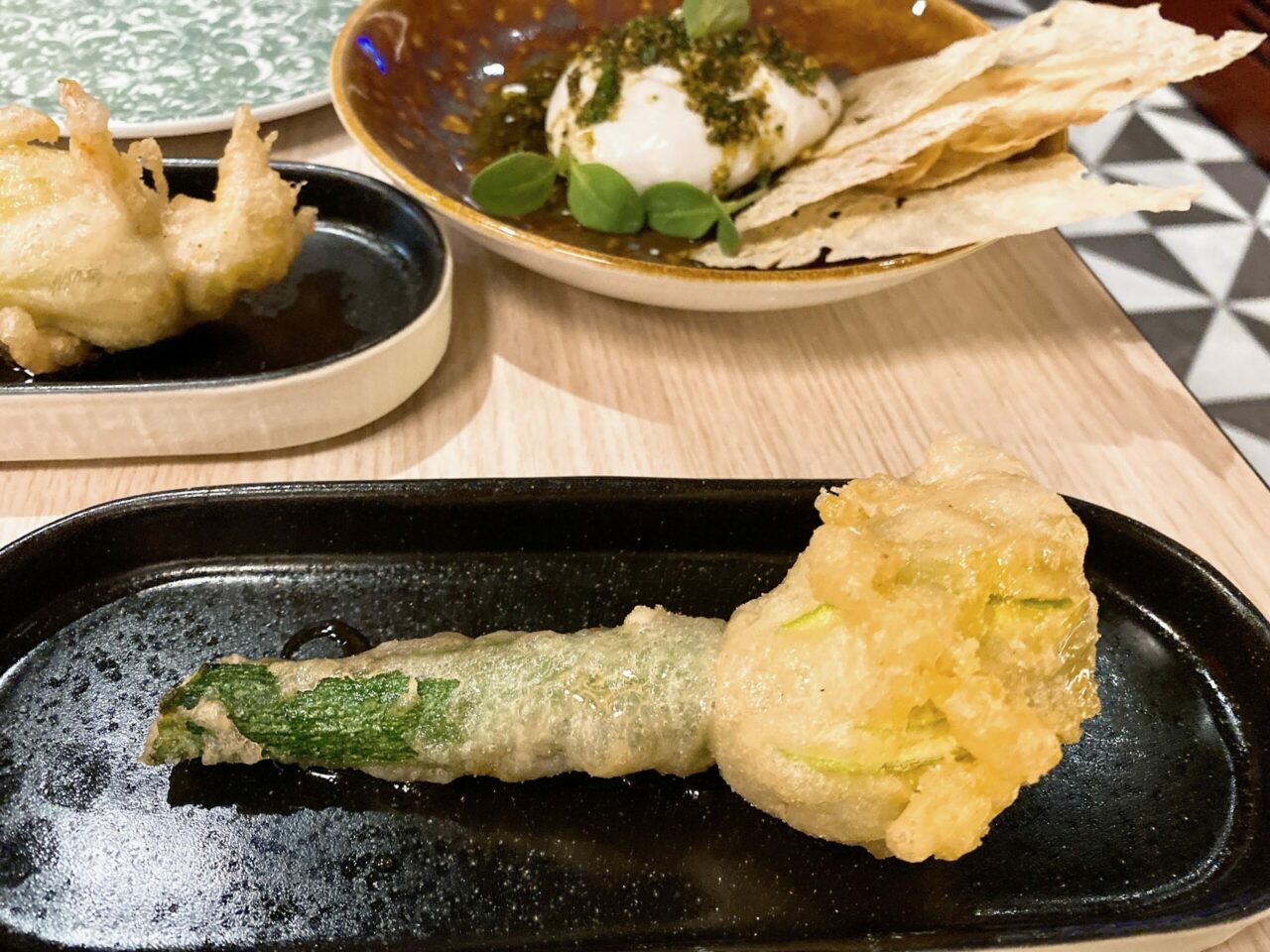 There’s a tranquil “terrace” area too with a living wall. The highlights for me from the meal were the courgette flower which was delicately handled in a wafer-thin batter and a light goats cheese stuffing, the sea bass that had a rich tomato sauce with punchy flavours of olives and capers, and the meatballs which were full of garlicky goodness and topped with a little salty parmesan.