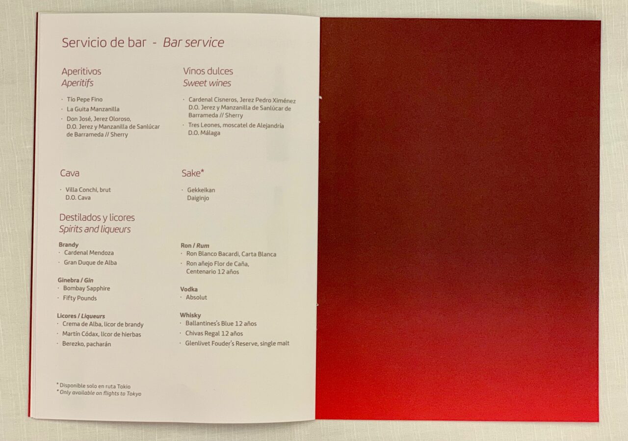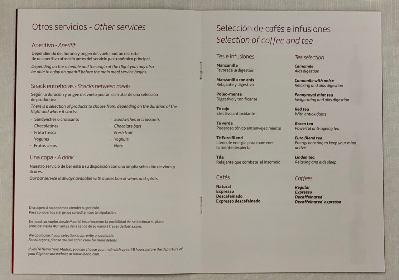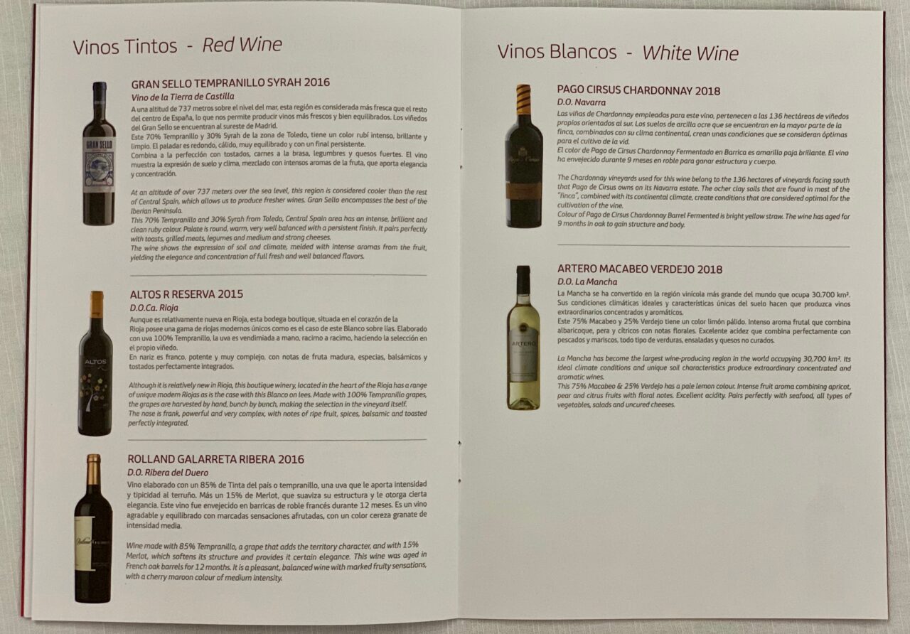 I followed the cabin manager’s wine suggestion and tasted the Verdejo which I enjoyed a lot. The last page of the menu has the other alcoholic beverages. There is a good selection of Spanish drinks including a couple of sherries, two gins and many other options.