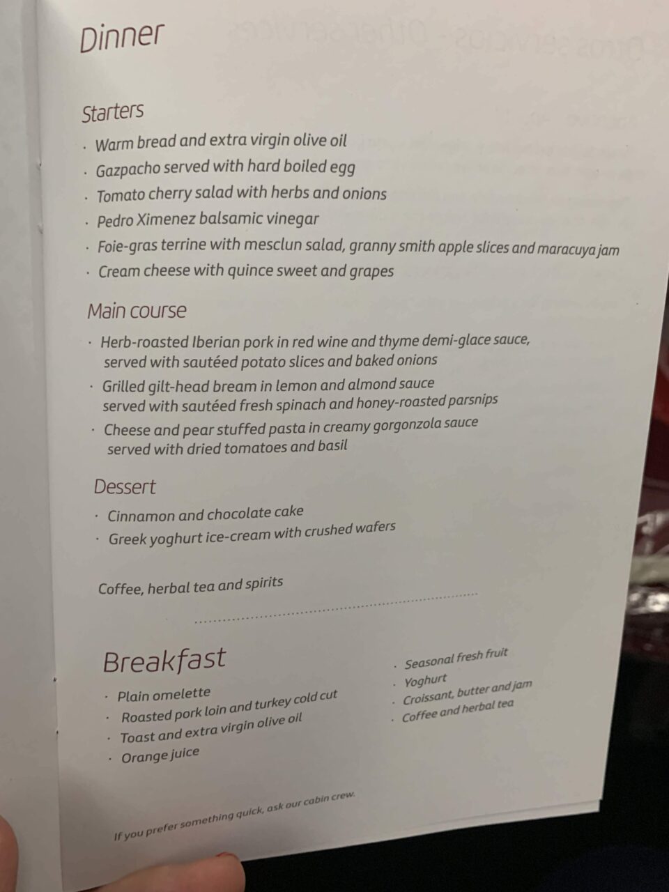 I also enjoy the wines on Iberia despite not being a massive fan of Spanish wine. I do find they usually are all high quality too although again the choice is very predictable. I tried the Navarra, which was excellent with a blend of Tempranillo – Merlot – Syrah. It was velvety smooth but with just the right amount of oak. The crew were terrific on this flight, and I was offered a top of my wine and water no less than four times!