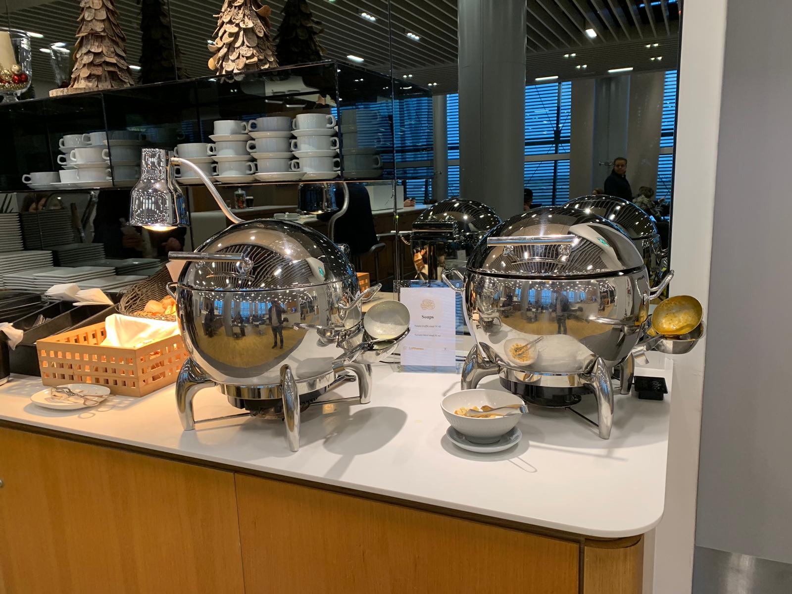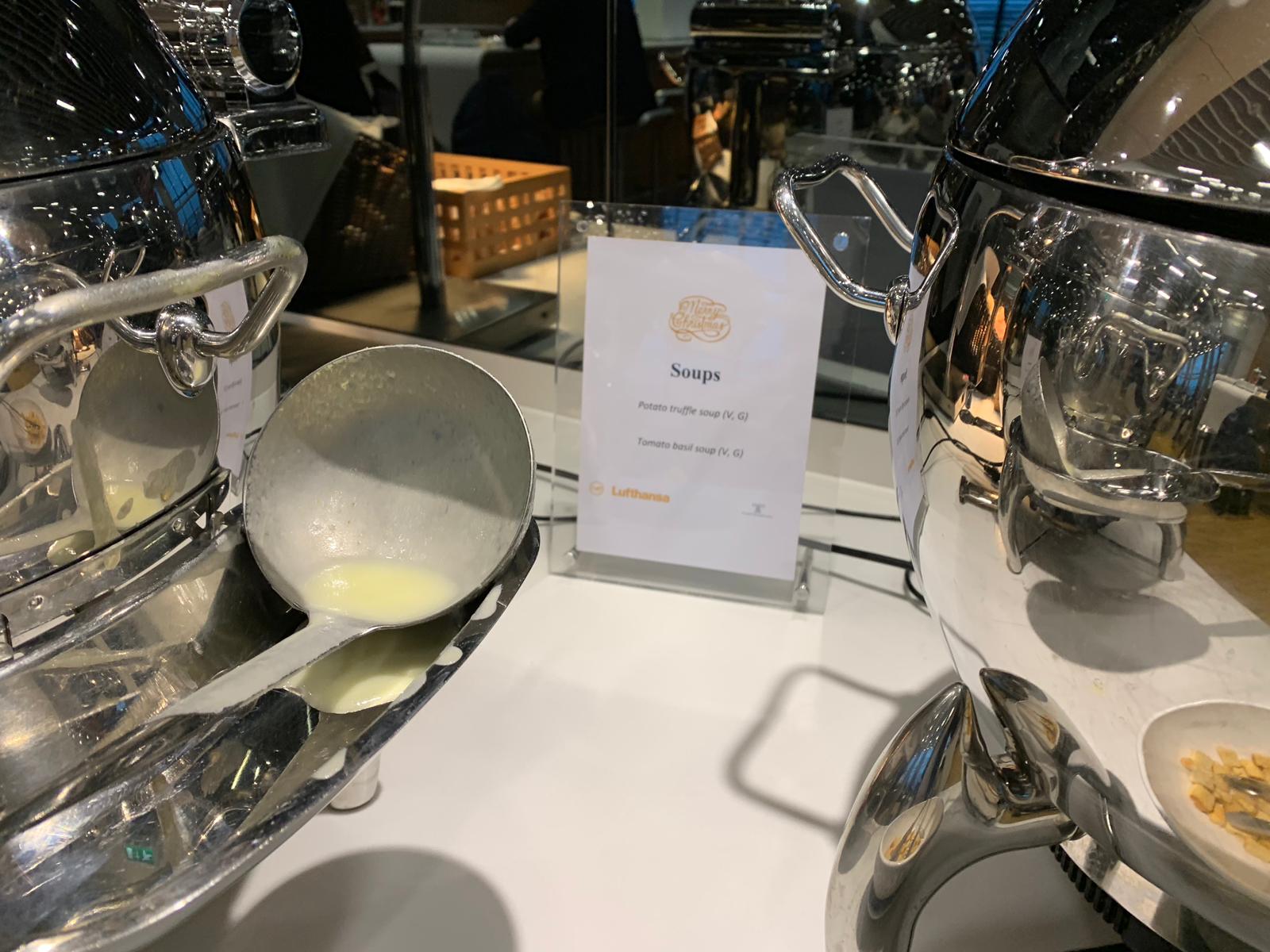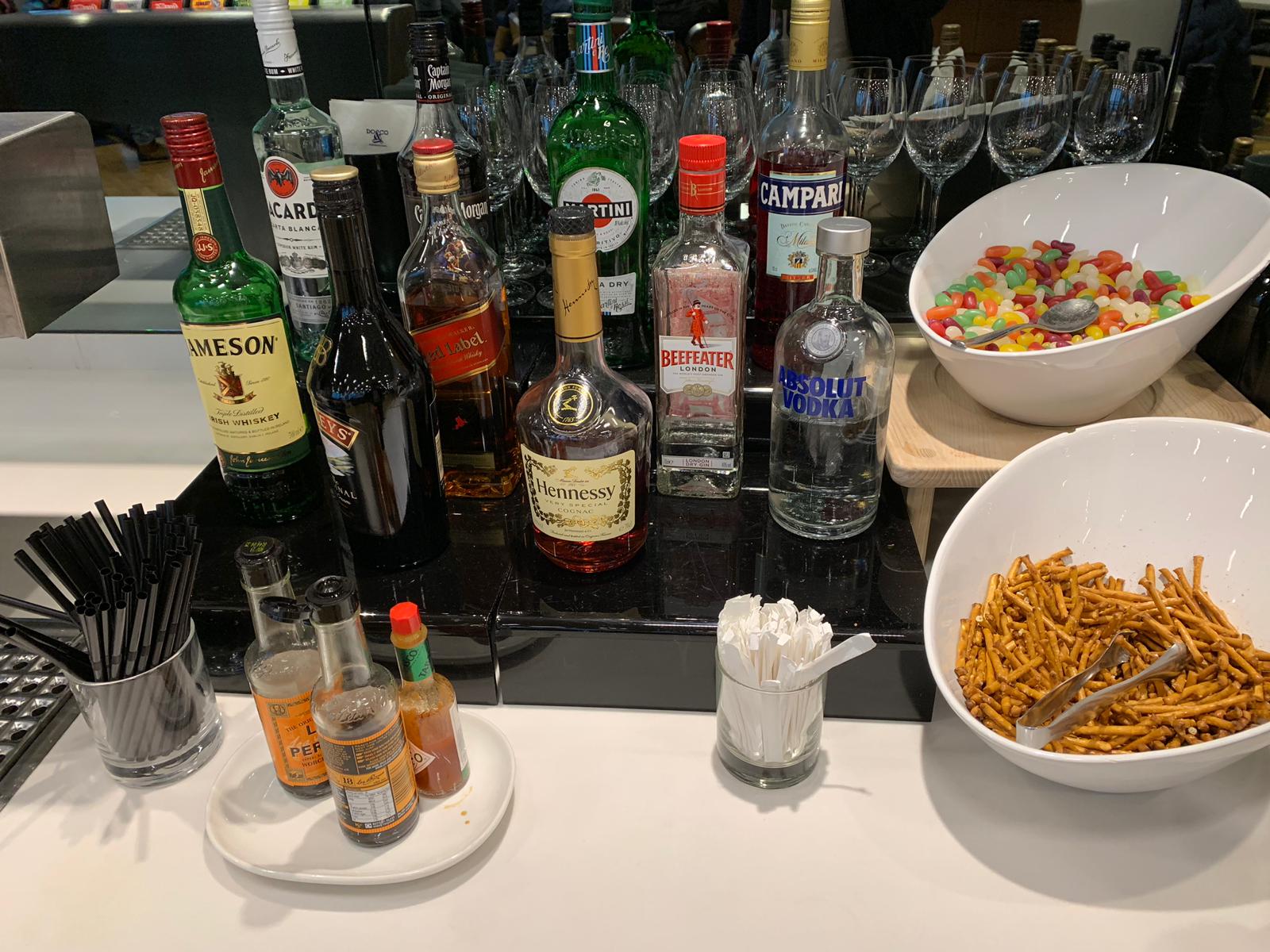 The lounge was quite dull in design but had everything you would need. There were hot and cold food selections including a choice of two soups and some pasta. For drinks, there was no champagne (which you do get for BA business class – often only on request). They did, however, have a decent Prosecco and a few wines to chose from. Spirits were pretty standard, but BA definitely has a broader choice. You can see a selection of the food and drinks below.