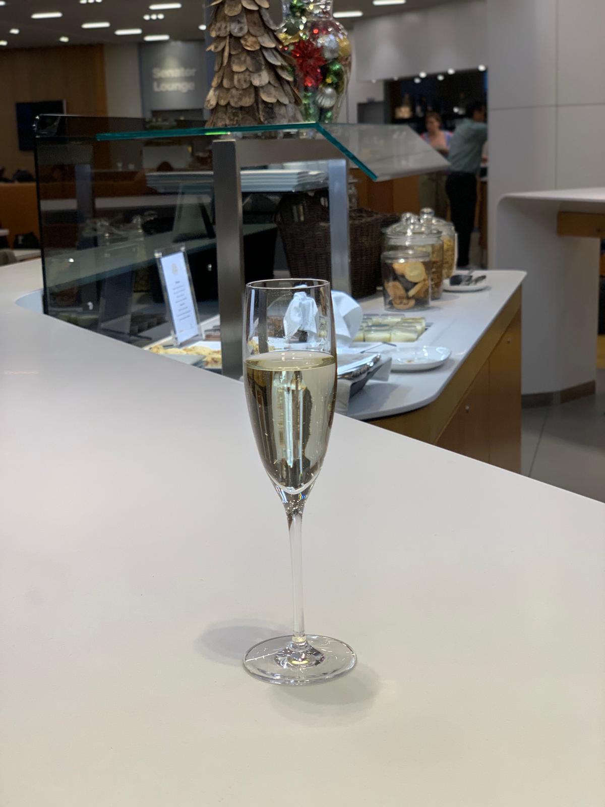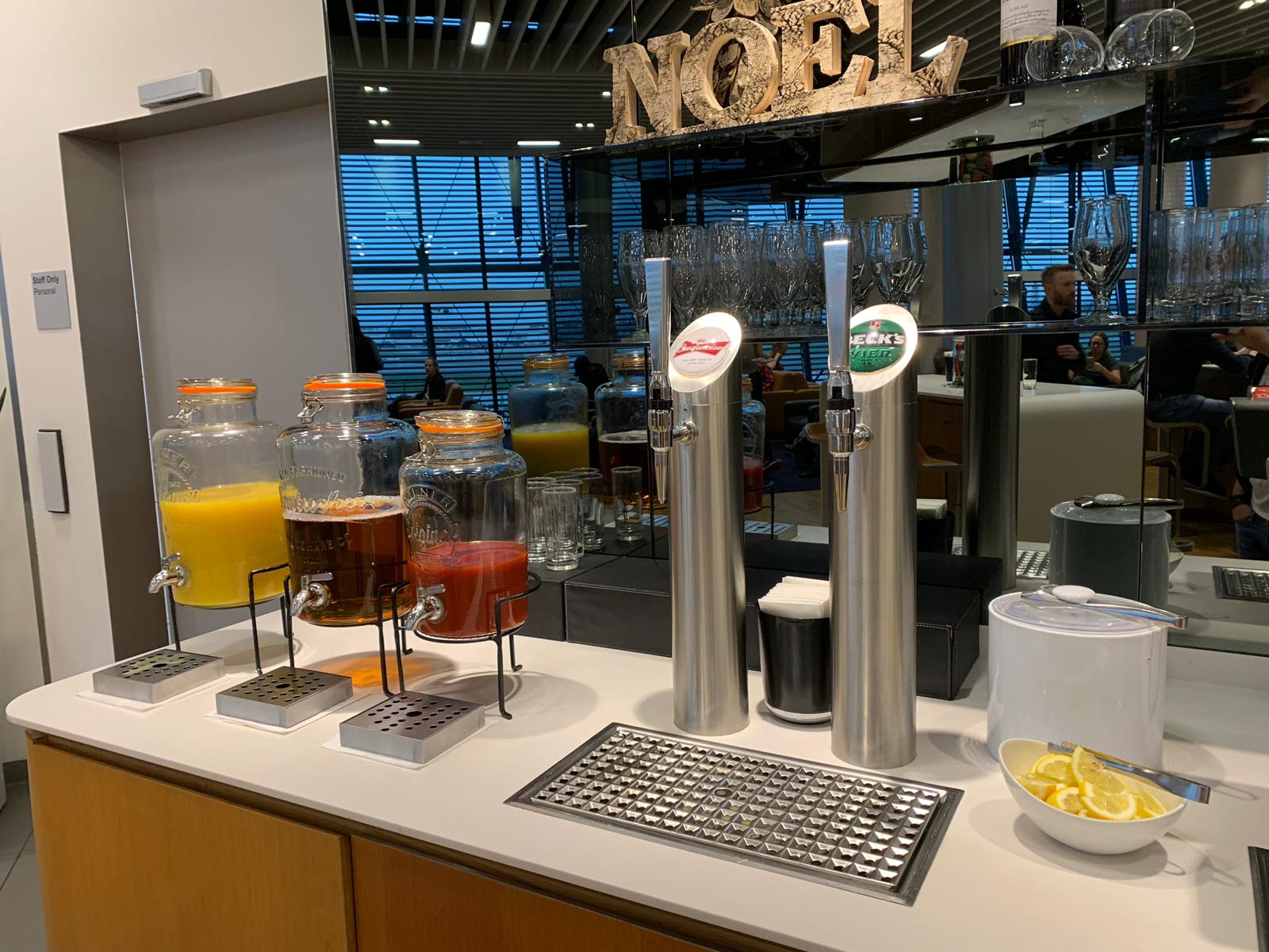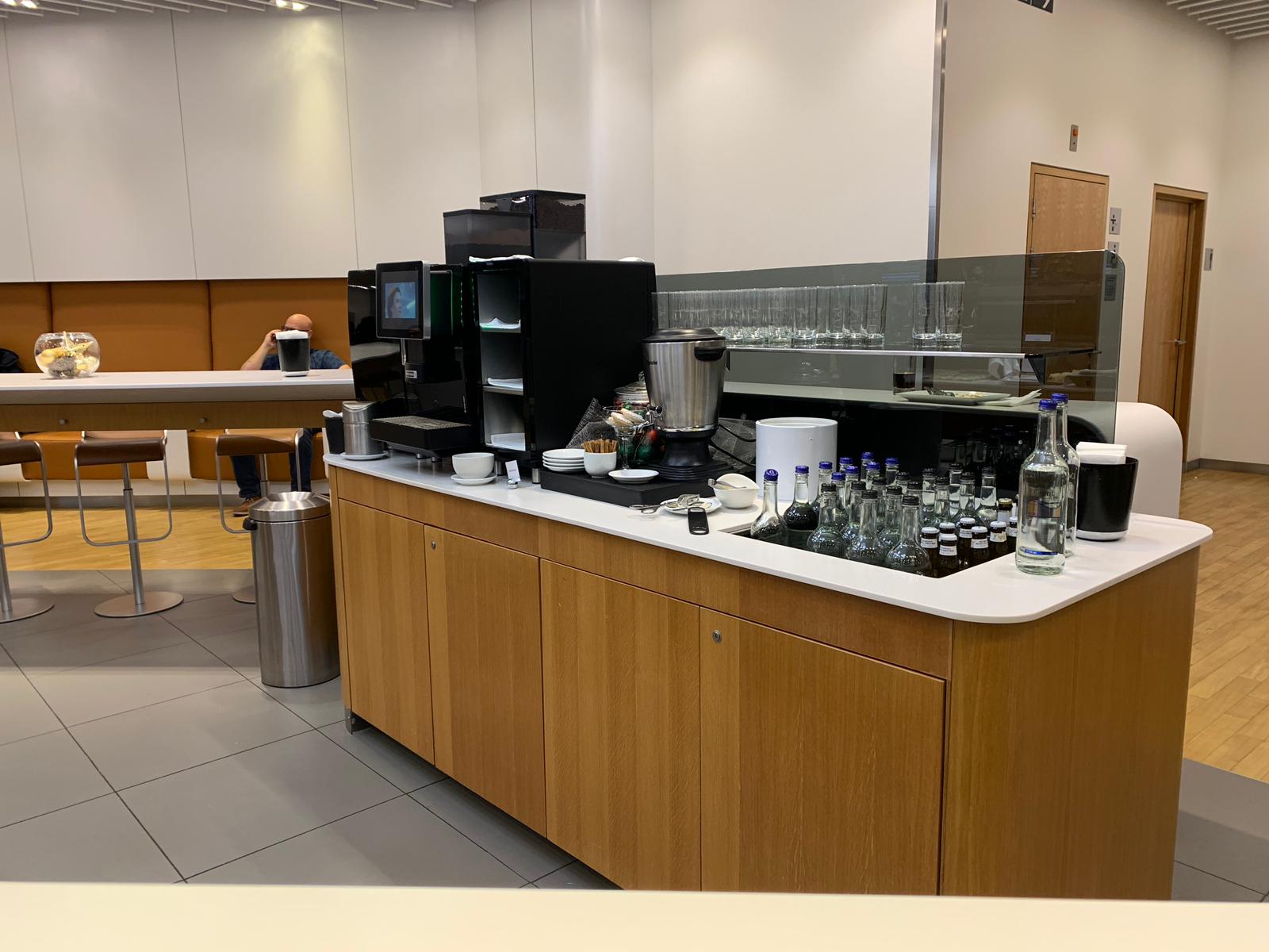 The lounge was quite dull in design but had everything you would need. There were hot and cold food selections including a choice of two soups and some pasta. For drinks, there was no champagne (which you do get for BA business class – often only on request). They did, however, have a decent Prosecco and a few wines to chose from. Spirits were pretty standard, but BA definitely has a broader choice. You can see a selection of the food and drinks below.