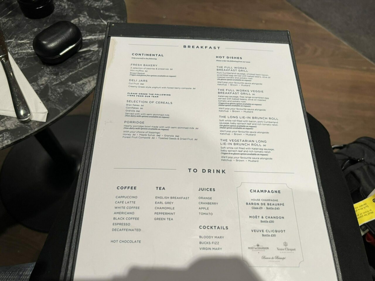 Menus and table service are provided in this lounge – with surcharges for premium alcohol. Here’s a look at the breakfast offering, which was more substantial than suggested on the website, as well as the drinks: