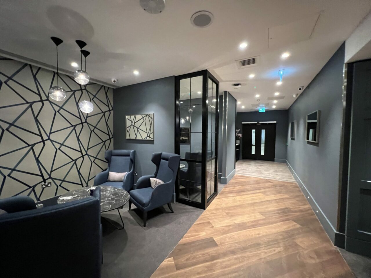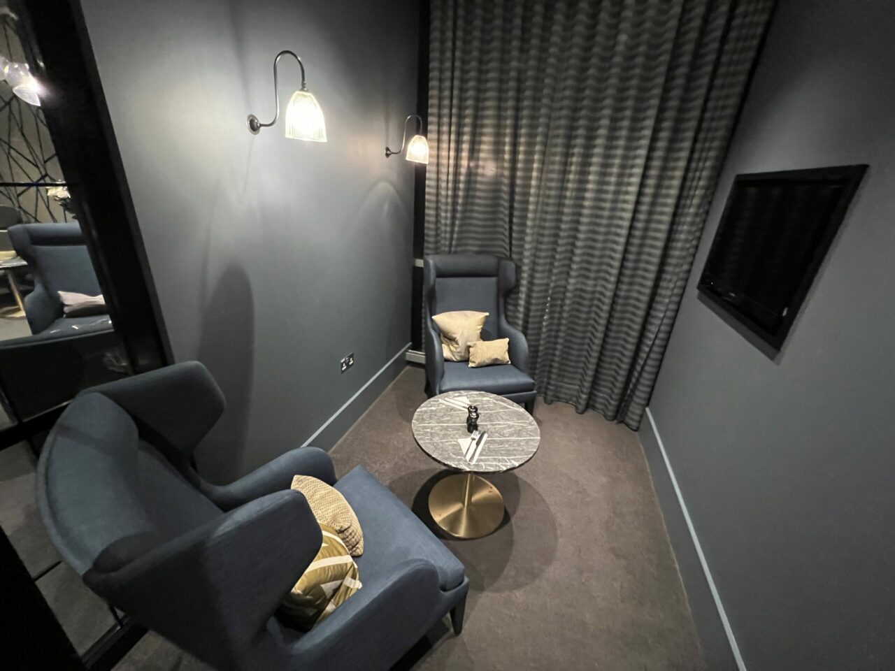 Directly after entering, I was welcomed by a member of staff almost one hour prior to my reserved slot who quickly validated my HSBC UK Lounge Key. The space is lit exclusively with lights due to the exterior light being blocked through the windows. There’s a rather odd seated area for two guests to watch television which I can imagine is rarely used.