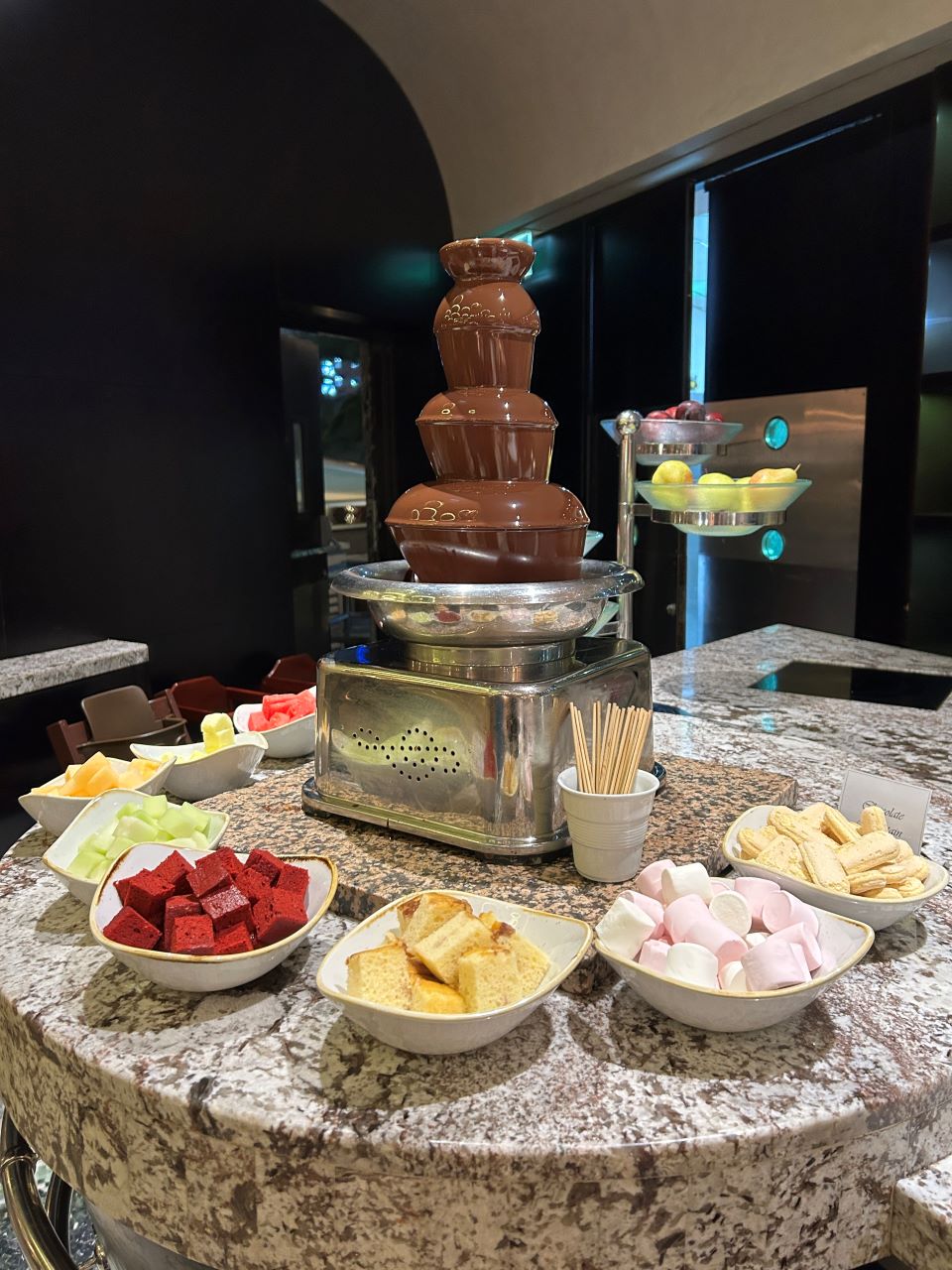 Even dessert had more options than anyone could possibly manage, including a chocolate fountain with plump marshmallows and ripe fruit for dipping. Plus, of course a large selection of baklava and local delicacies as well as more western options.