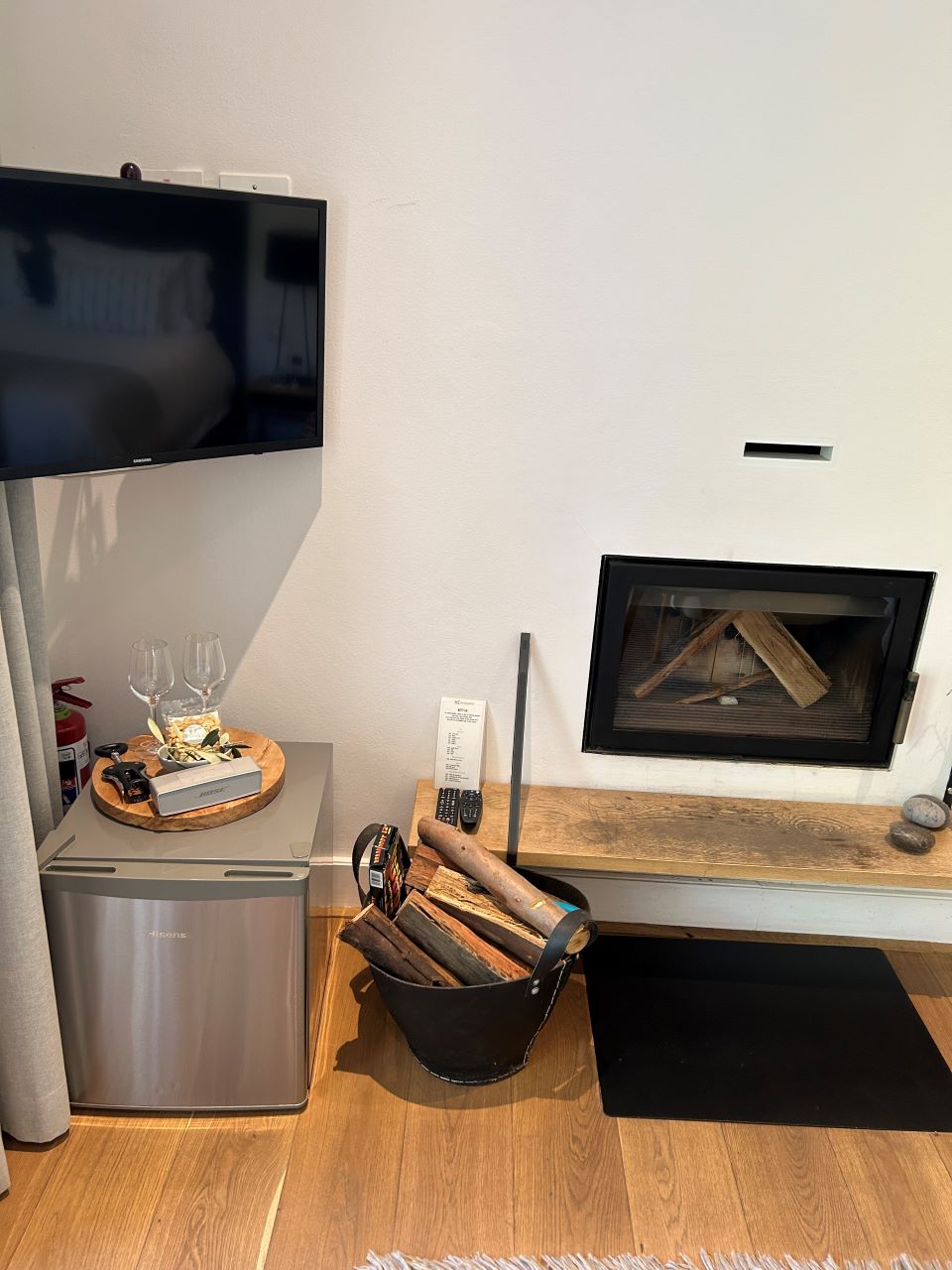 There are only six rooms in the hotel which are nearly all different, and I have either stayed in or been in 5 of them. The top floor ones definitely have the best views but are slightly less convenient for lugging those wine purchases upstairs or popping to the pool. Upstairs, I have stayed in Balcony Suite La Vivienne, which has a large balcony but is the smaller of the rooms upstairs but still felt a good size at 35m². Superior Suite Le Godin is much larger inside and has a separate fireplace with wood burning fire. Outside, there is a huge terrace with two sunloungers and a table and chairs. There is a second suite large suite upstairs as well.