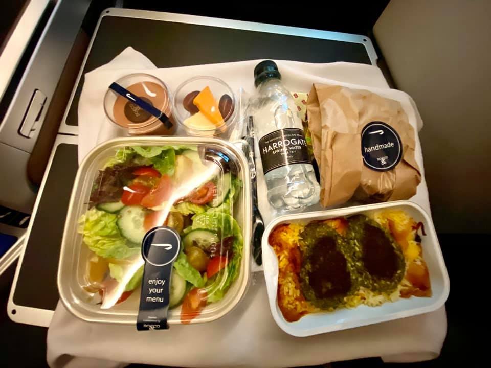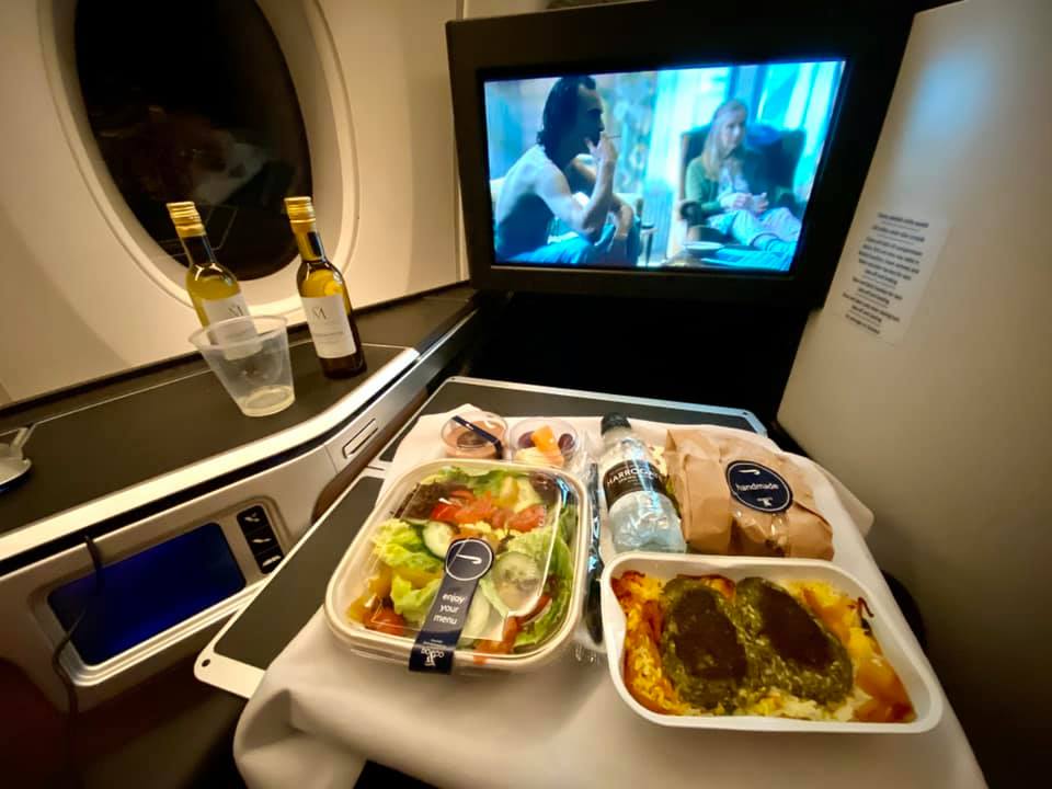 Sadly although the food has changed to include a hot main, there has been no change to the drinks. They are basically the short-haul drinks with the addition of miniature spirits you would normally get on long haul. Unfortunately, all of these are served in the horribly flimsy plastic cups that you get in economy. I had bought along my own Go Vino plastic champagne flutes to add a little more style to the occasion. You can read more about how to make your flight more luxurious and comfortable here.