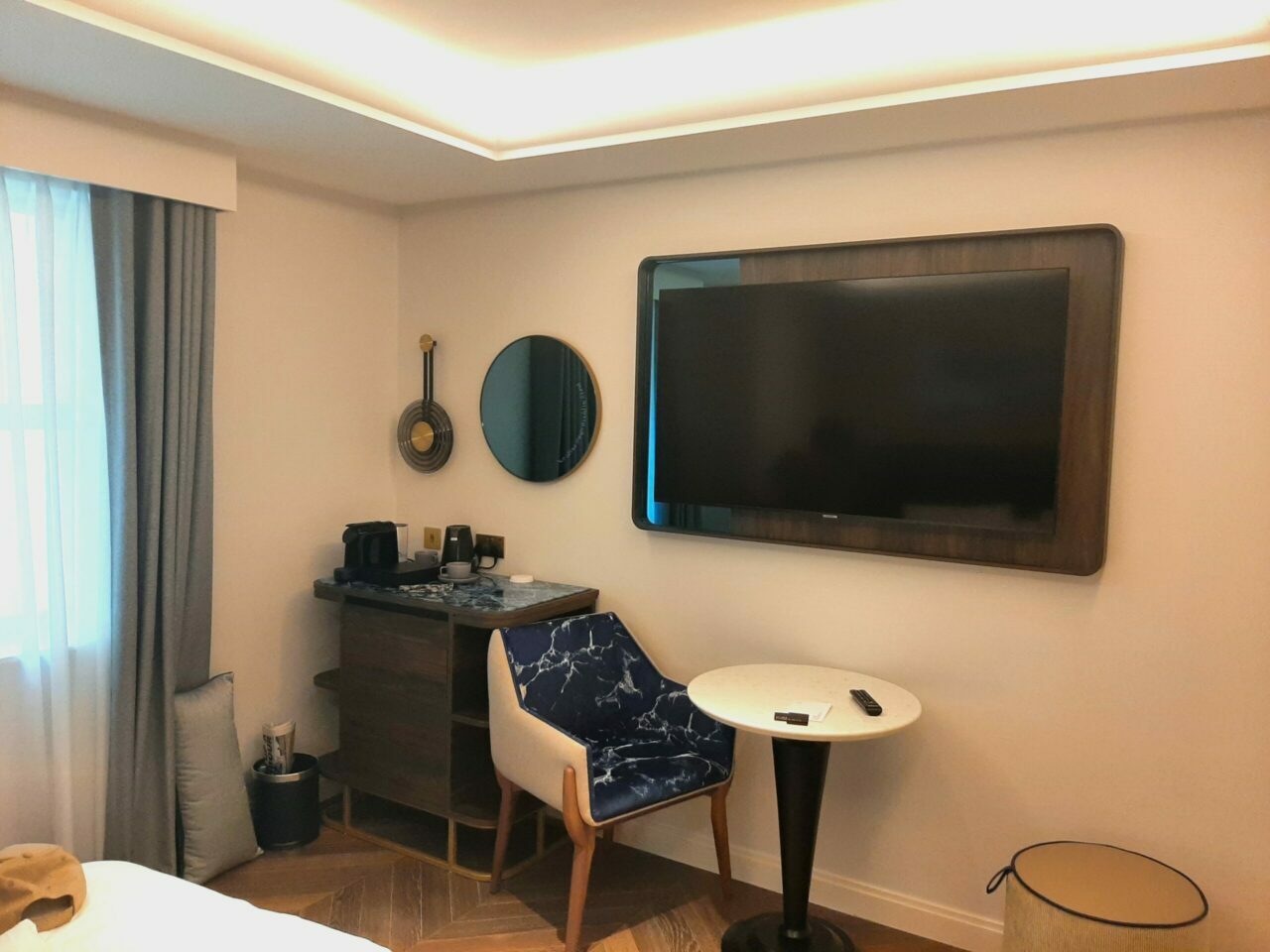 Our friends were in a King Delux on the 4th floor in probably a smaller main room than ours, but a much bigger bathroom opposite the end of the bed. The table and chair at the end of the bed were in a ridiculous position blocking access to the bathroom and even round to the main door, and so they moved it into the only available site – some dead space by the toilet. It would add a new dimension for Zoom calls perhaps!