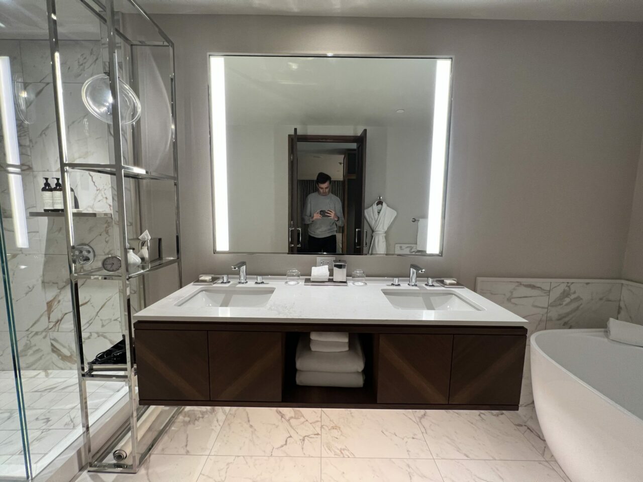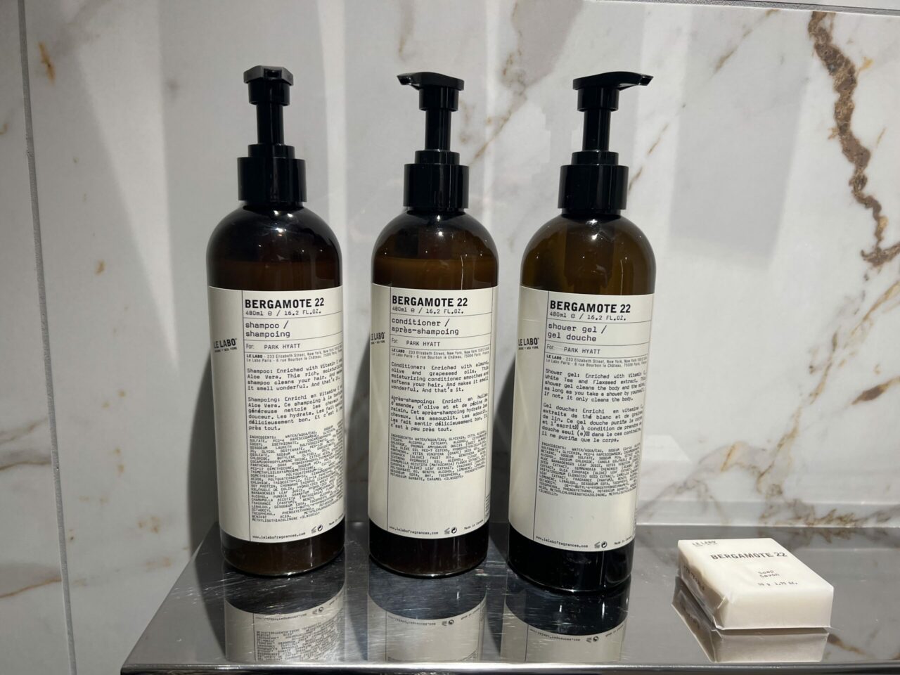 Double sinks, a freestanding bath and large shower complete the marble-clad bathroom with feels bright and spacious. The hotel uses the excellent Le Labo amenities in large pump bottles for the cleanser, shampoo and conditioner.
