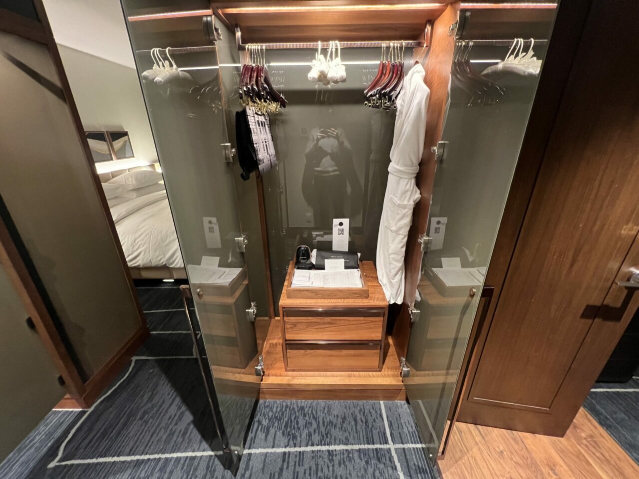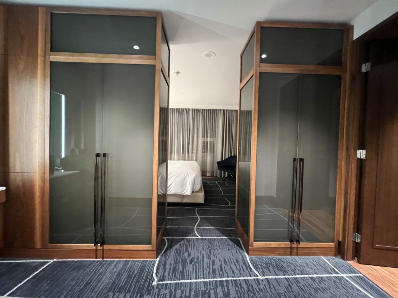 Into the bedroom and there is decent zoning of the room thanks to two large wardrobes – which is easily bigger than the space I have at home. The usual equipment, including iron and ironing board, can be found inside