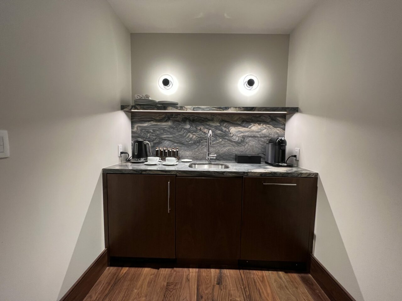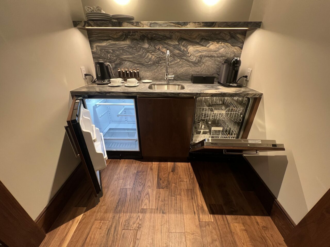 A hotel representative then took me for a tour of their One Bedroom Deluxe Corner Suite on the 14th floor. Immediately after entering the room there is a small kitchen area that features a fridge, sink and dishwasher.