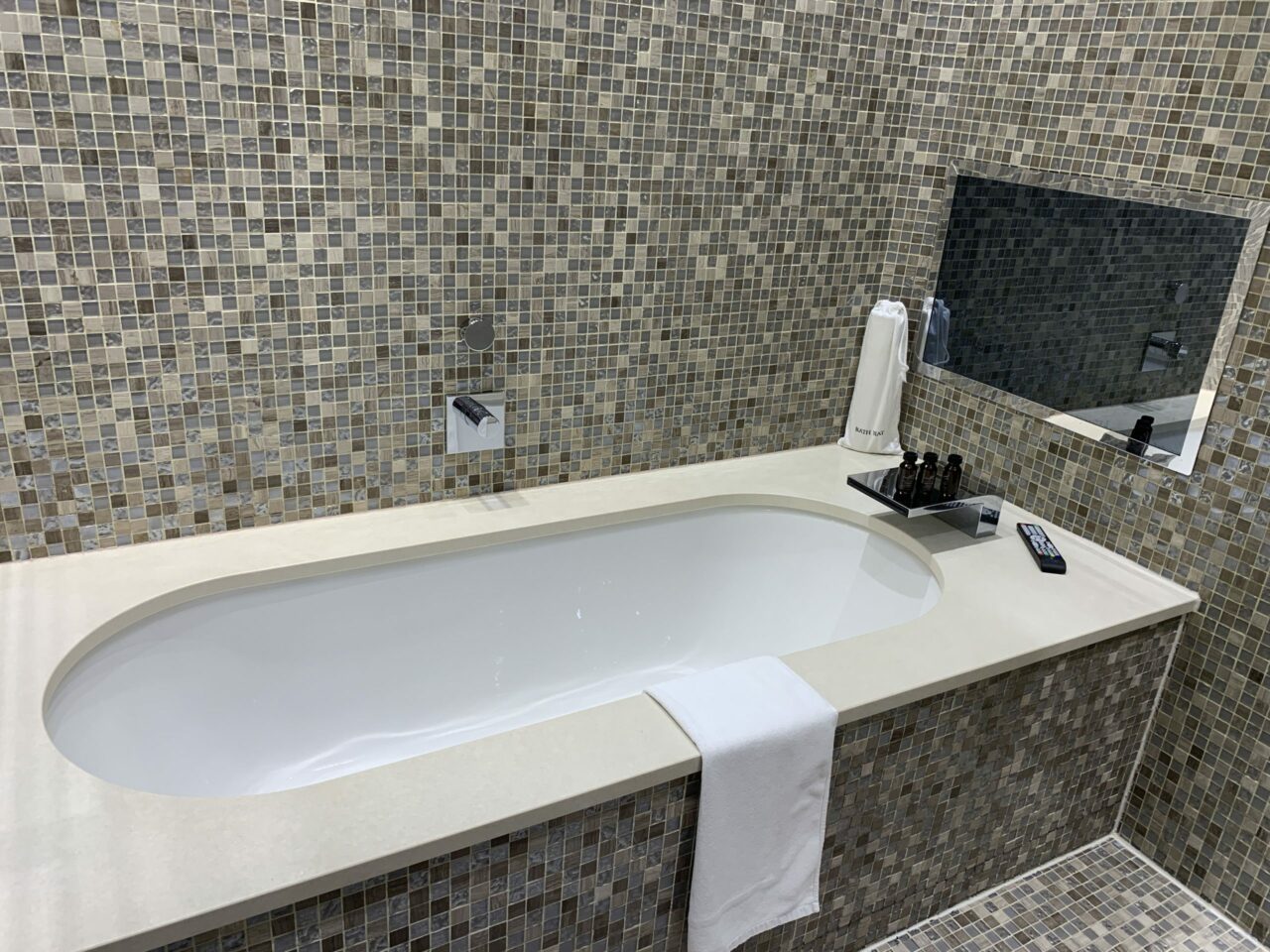 The bathroom had 2 large freestanding baths which were just the perfect size. I liked the fact that there was an ice bucket between the two baths for your champagne! There was also a large TV screen, 2 basins, a magnifying mirror, and the most complicated shower I have ever seen. In fact, it was so complicated, there were instructions inside. You had a choice of 3 different programs, similar to those you would find in a spa experience shower. Alternatively, you could select which jets you wanted on. There was an enormous overhead rain shower and body jets. The toiletries provided were Exclusive hotel’s own brand and one of my favourite hotel toiletries. They come in large tubes and have a lovely refreshing green tea scent.