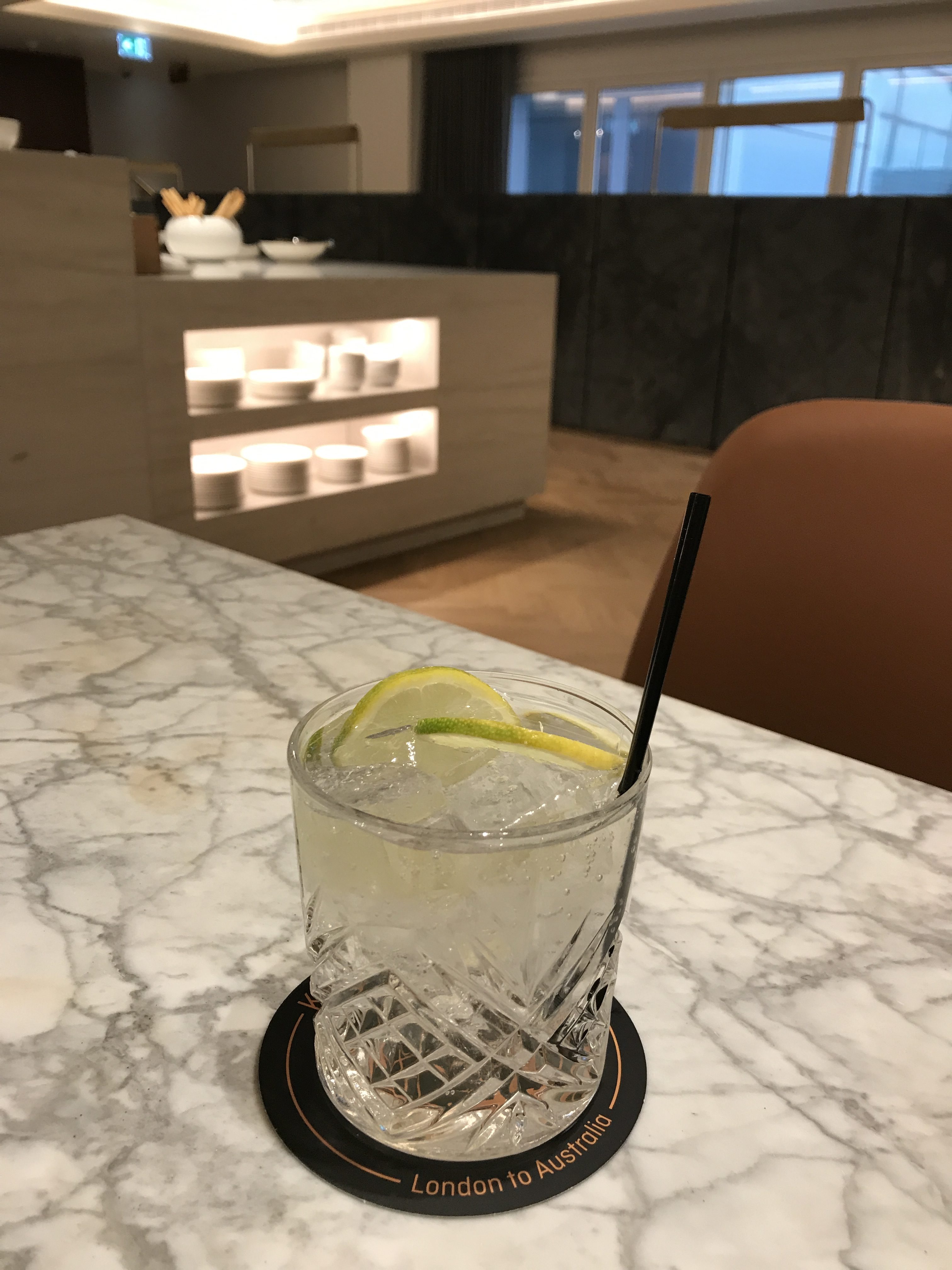 Next I headed up the impressive staircase to my favourite design feature, the bar. It reminds me of the BA Boston lounge bar with its circular shape and views of the airfield. Here you can order cocktails, a glass of wine or all the usual drinks. The cocktail list is fairly limited to just their signature cocktails but I am sure they would make you any well-known cocktail. The signature cocktails were designed by mixologists from Australia’s famous Rockpool restaurant.