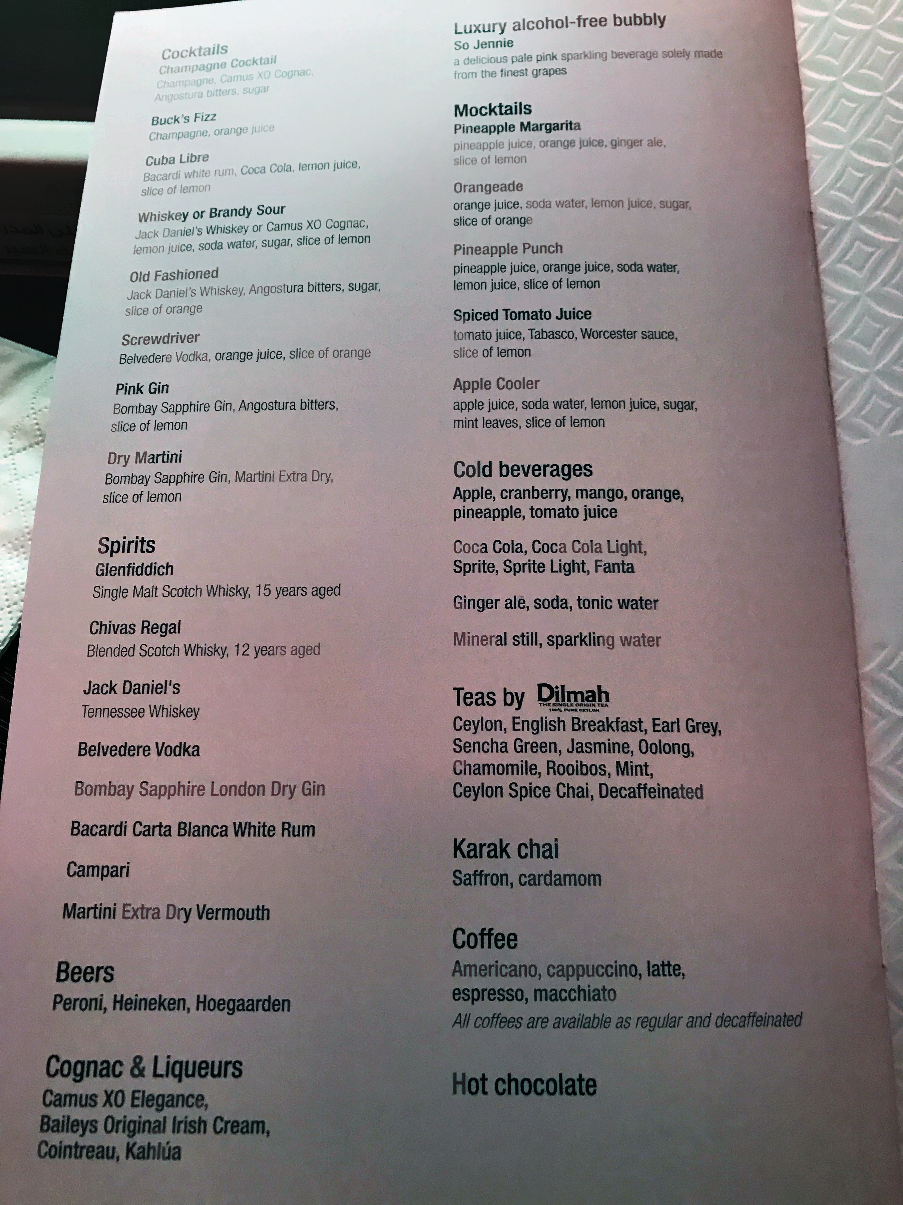 This was pretty orderly and we were welcomed on board by the cabin crew member that would serve us and offered a drink and a hot or cold towel. The towels on Qatar are thick and soft, unlike some airlines where they are more akin to a dishcloth! I chose the Rose champagne which is the better of the two Lanson champagnes on board for me. I have to say that I am not a big fan of either but I forced it down in the name of research! You could also have water or their signature lemon mint drink which is very refreshing (and would be even better with a shot of rum or vodka!!)