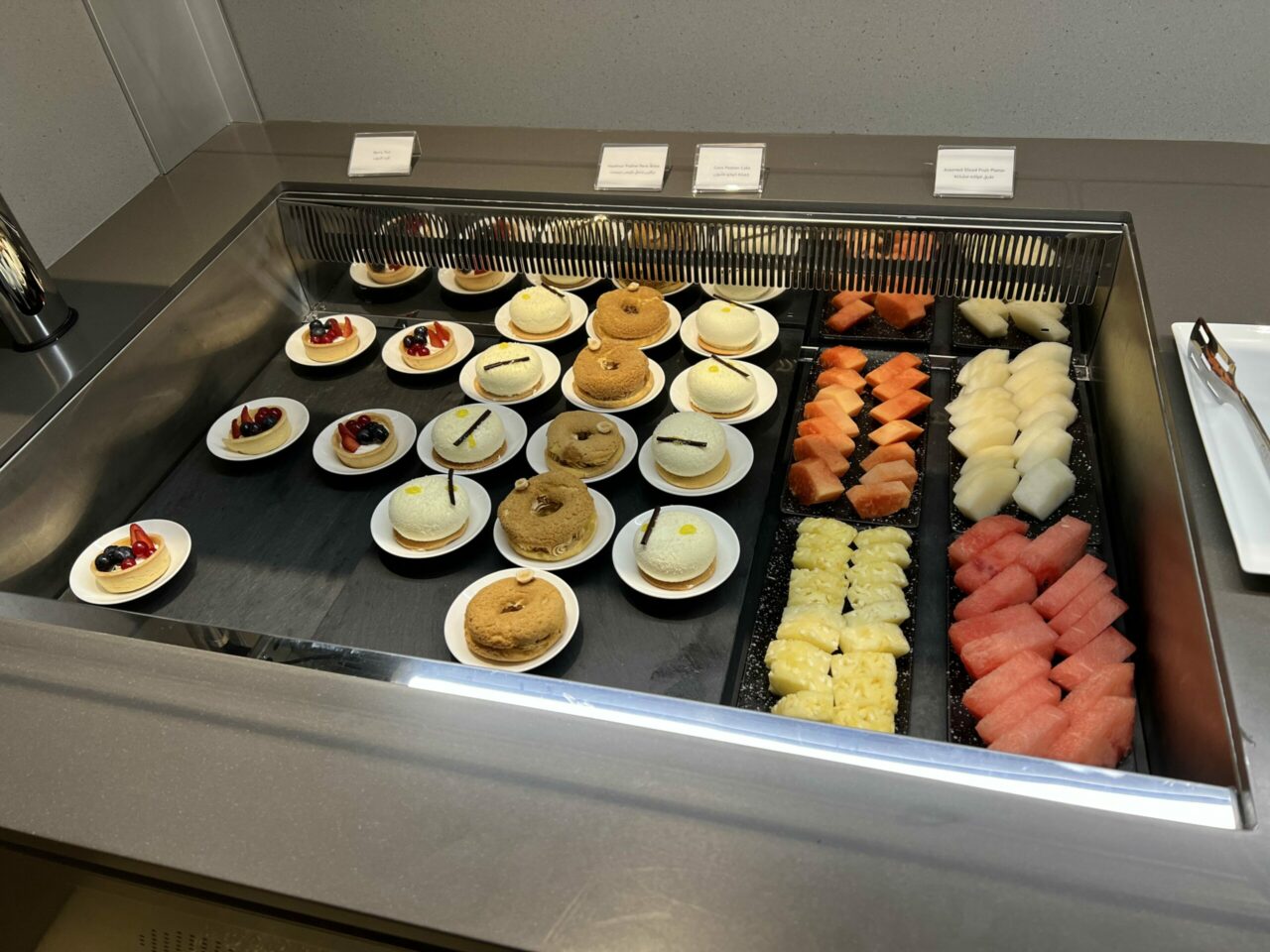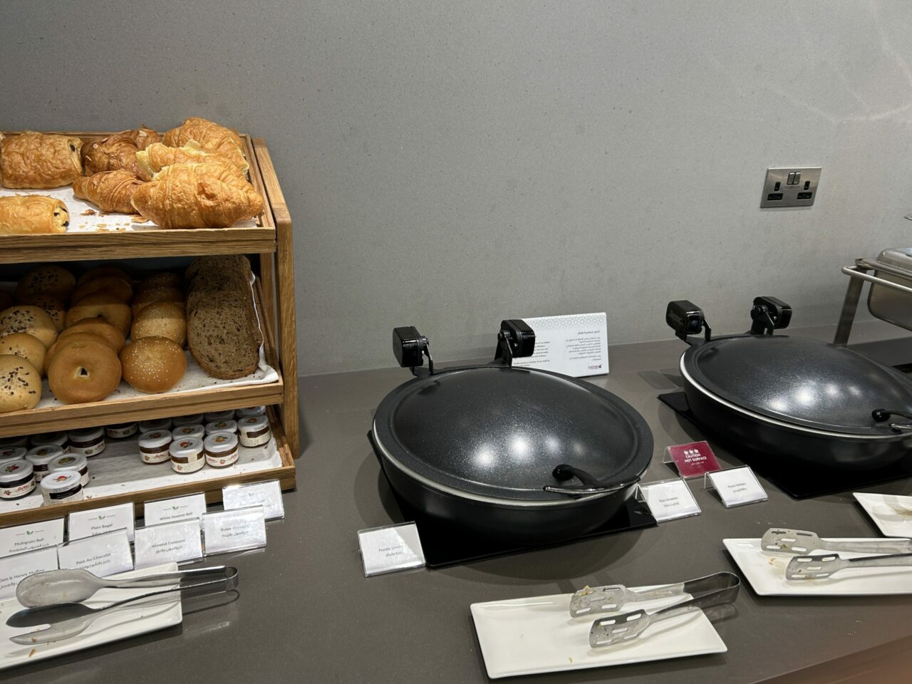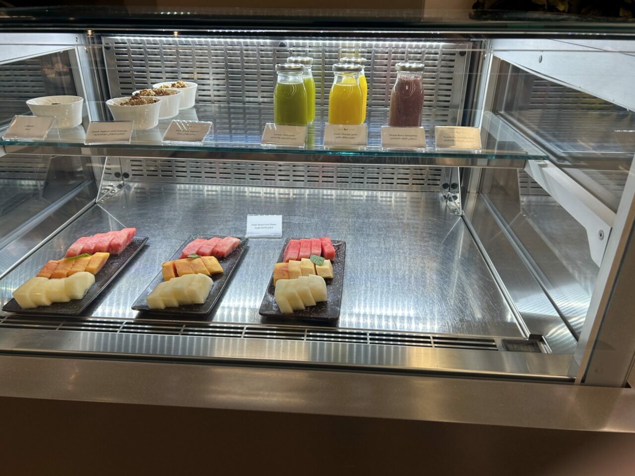 I was there at breakfast time, and there was a decent choice of food available. There were cereals, whole and cut fruit, yoghurt, pastries, muffins, bread (and a toaster) omelette, chicken sausages, potatoes, congee, foul medames, meat and cheeses and a banana bread pudding with custard.