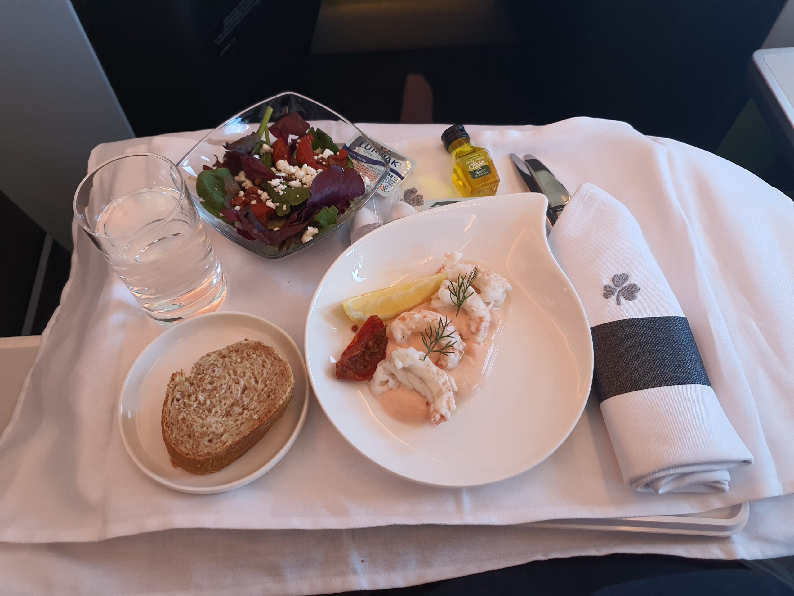Lunch was served about two hours into the flight. The starter options were either prawns in Marie Rose sauce with sun dried tomatoes, or goat’s cheese with beetroot. I decided to go for the prawns, which were delicious, though not as visually appealing as they tasted.