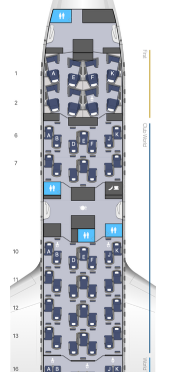 The flight was operated by a Boeing 787-9. There are two Club World cabins on the aircraft: a small sixteen-seat Club World cabin directly behind the First cabin, a galley, then a much larger Club World cabin. It was the older “dormitory-style” yin yang Club World seating, and I picked the rear-facing window seat 6K, located at the front of the smaller cabin. My husband was seated next to me in the forward-facing seat 6J.