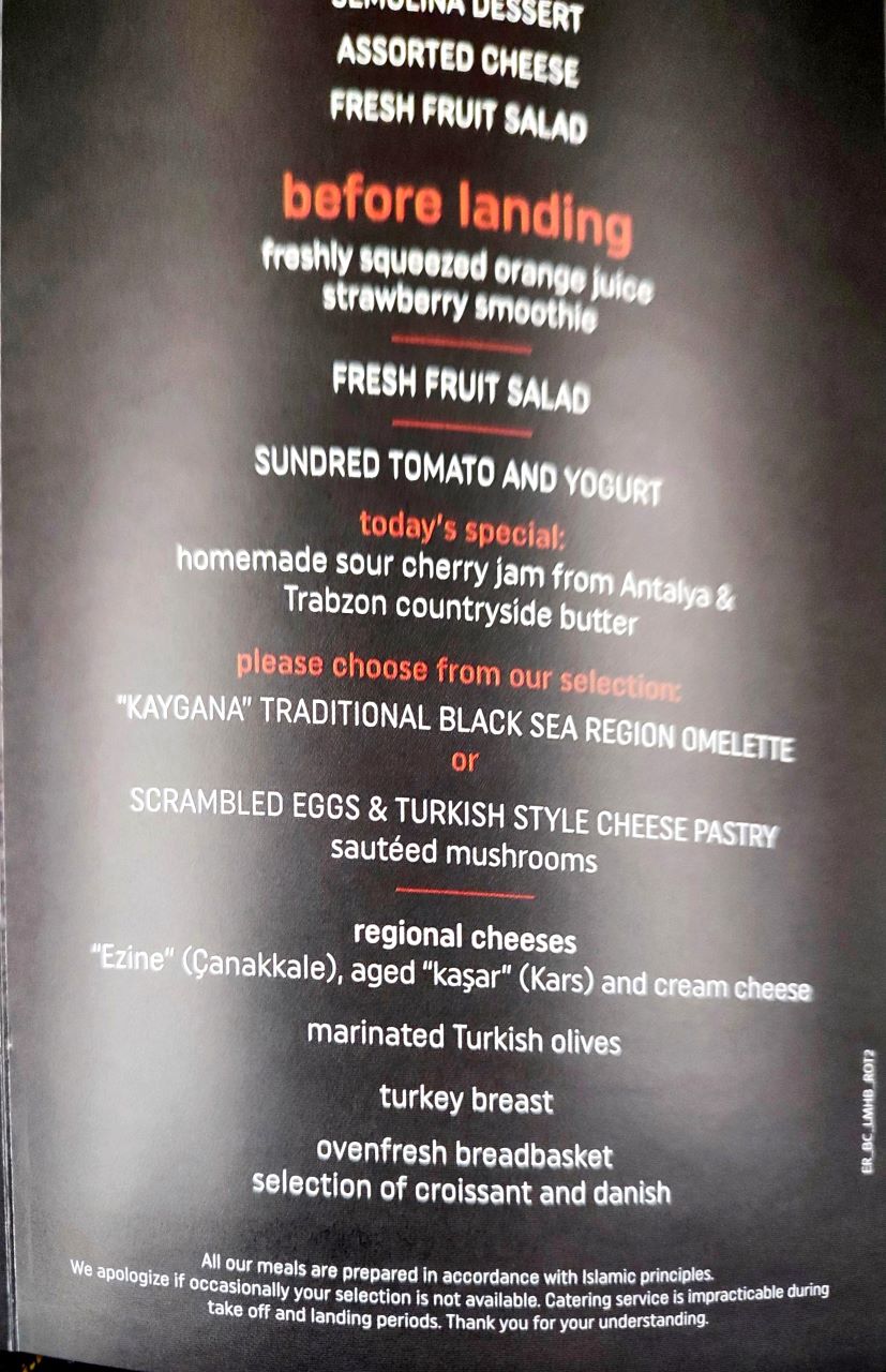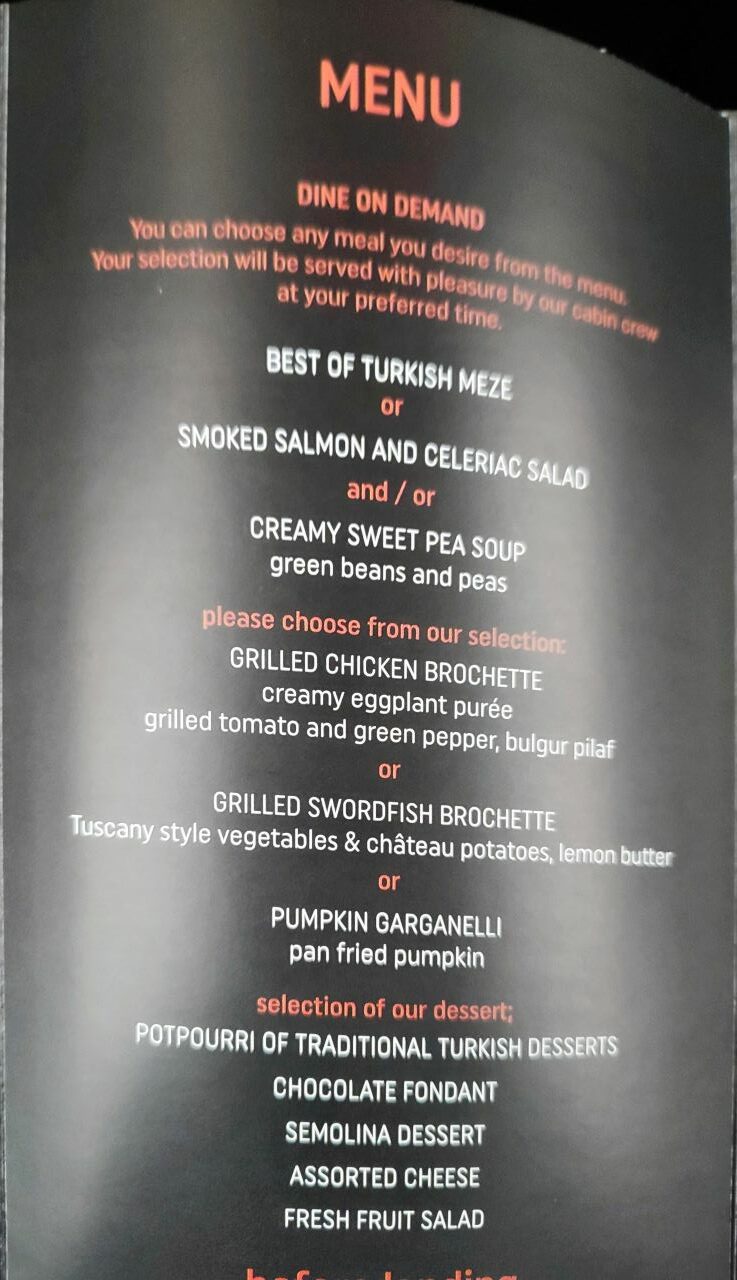 Firstly on checking the Turkish Airlines website, we thought that we would be able to select a main meal from an extensive range displayed up to 48 hours prior to departure, however, this didn’t happen, all you actually got to choose from was actually only the three choices that would be offered on the actual flight and in our opinion hardly fine dining ( Grilled Chicken Brochette, Grilled Swordfish Brochette or Pan Fried Pumpkin.)