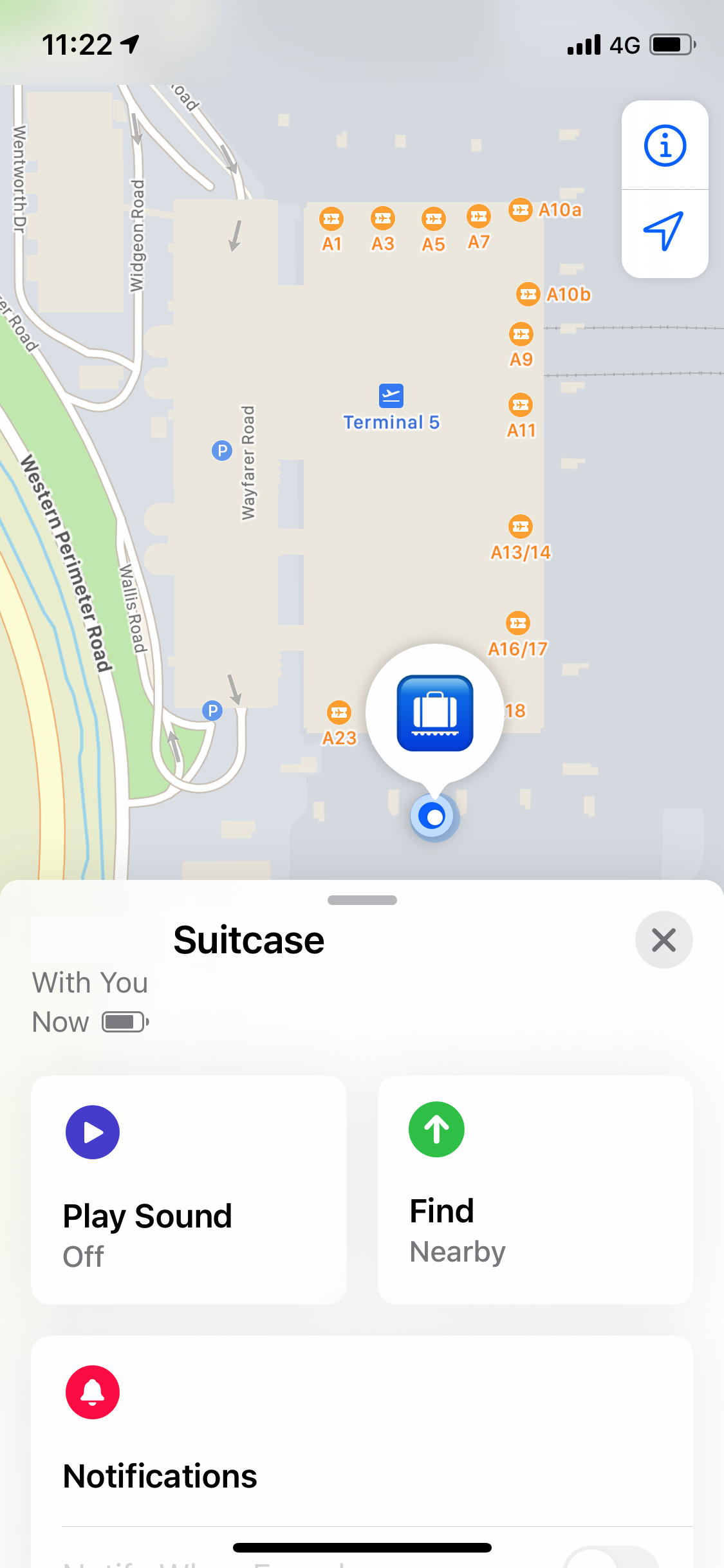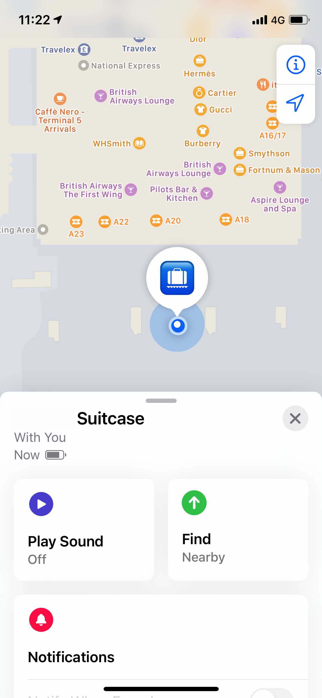 As you can see, it very accurately shows that the bag was at gate A22, which was our gate at the time of boarding. It was so close to me that it thought it was with me. Then you can see as we taxi the bag is moving along with us (before I popped my phone into flight mode). For £99 for 4 tags it really is incredibly accurate and a great way to track your luggage if you sometimes get nervous that it might go missing. These are roughly the size of a thicker £2 coin so nice and easy to hide.