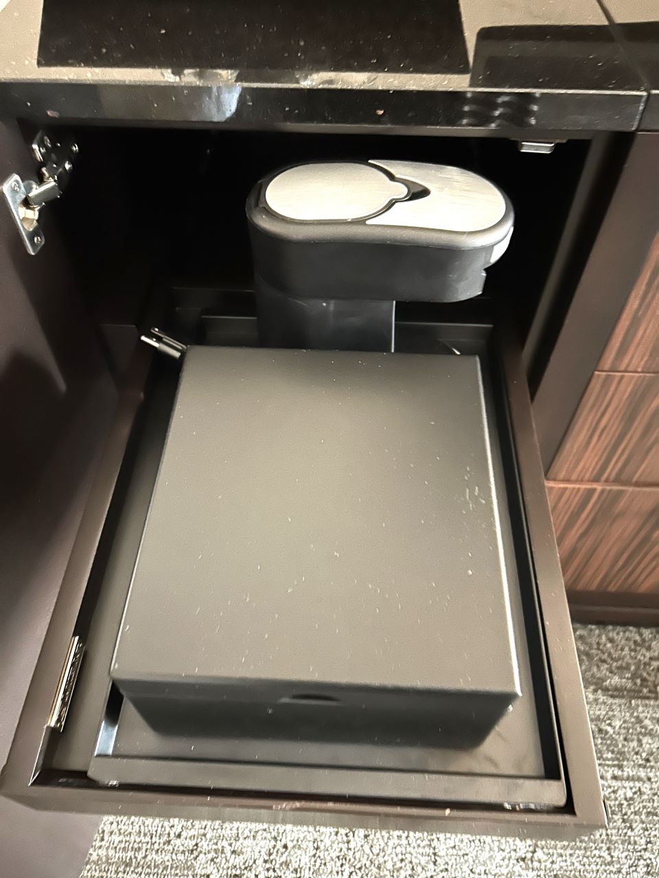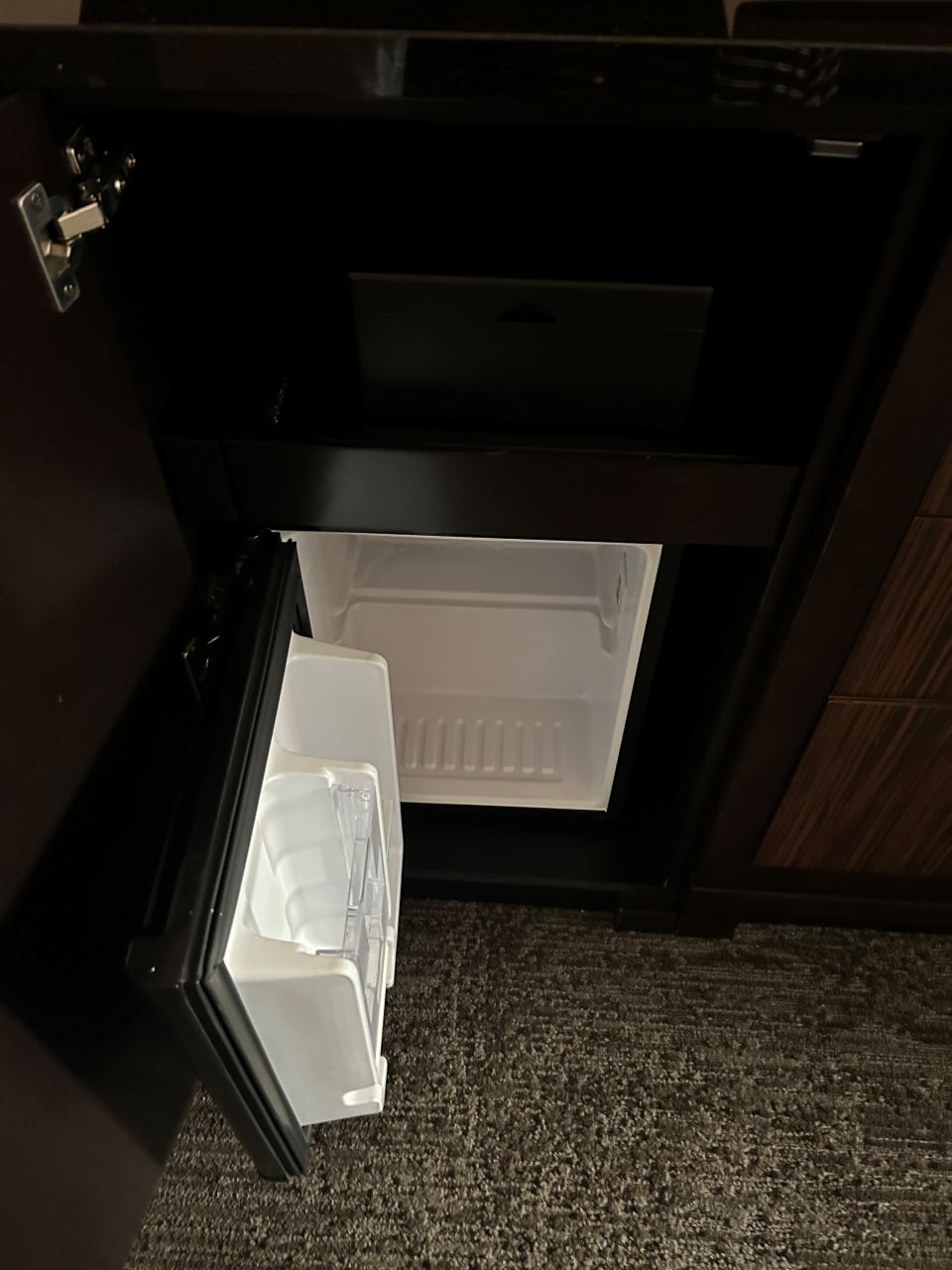 Hidden away was an empty but large fridge and a coffee maker with Starbucks coffee.