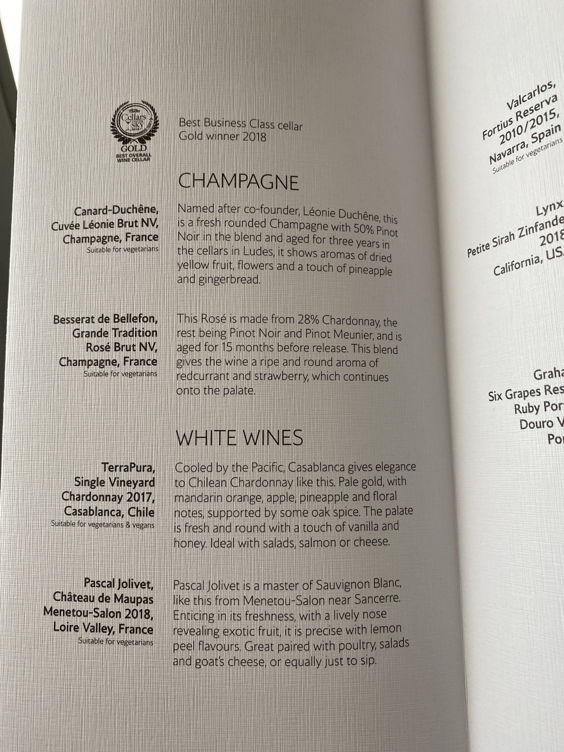 They recently introduced a range of cocktails and cocktails in Club but I have to say I was not a fan of them. Although it does not seem to be listed, they still do a Kir Royale which to me is the best way to jazz up a dull champagne. So that is what I ordered. The current champagne onboard is the Canarde Duchene Leonie which Virgin also serve. I don’t mind it and for me it is preferable to the previous Henriot or Henrio- oh, no! as I liked to call it. However, I would not describe myself as a big fan of the Canard Duchene.
