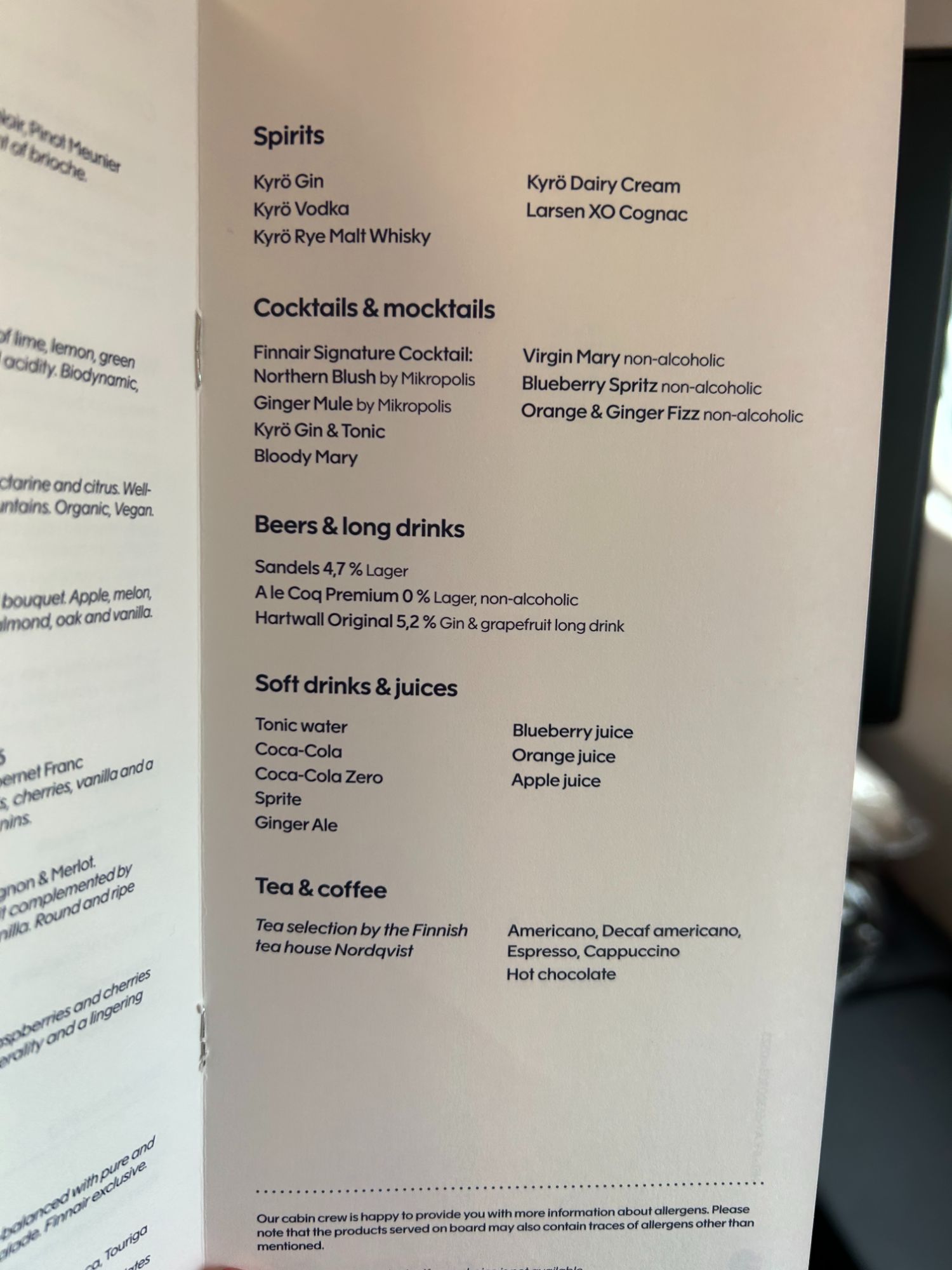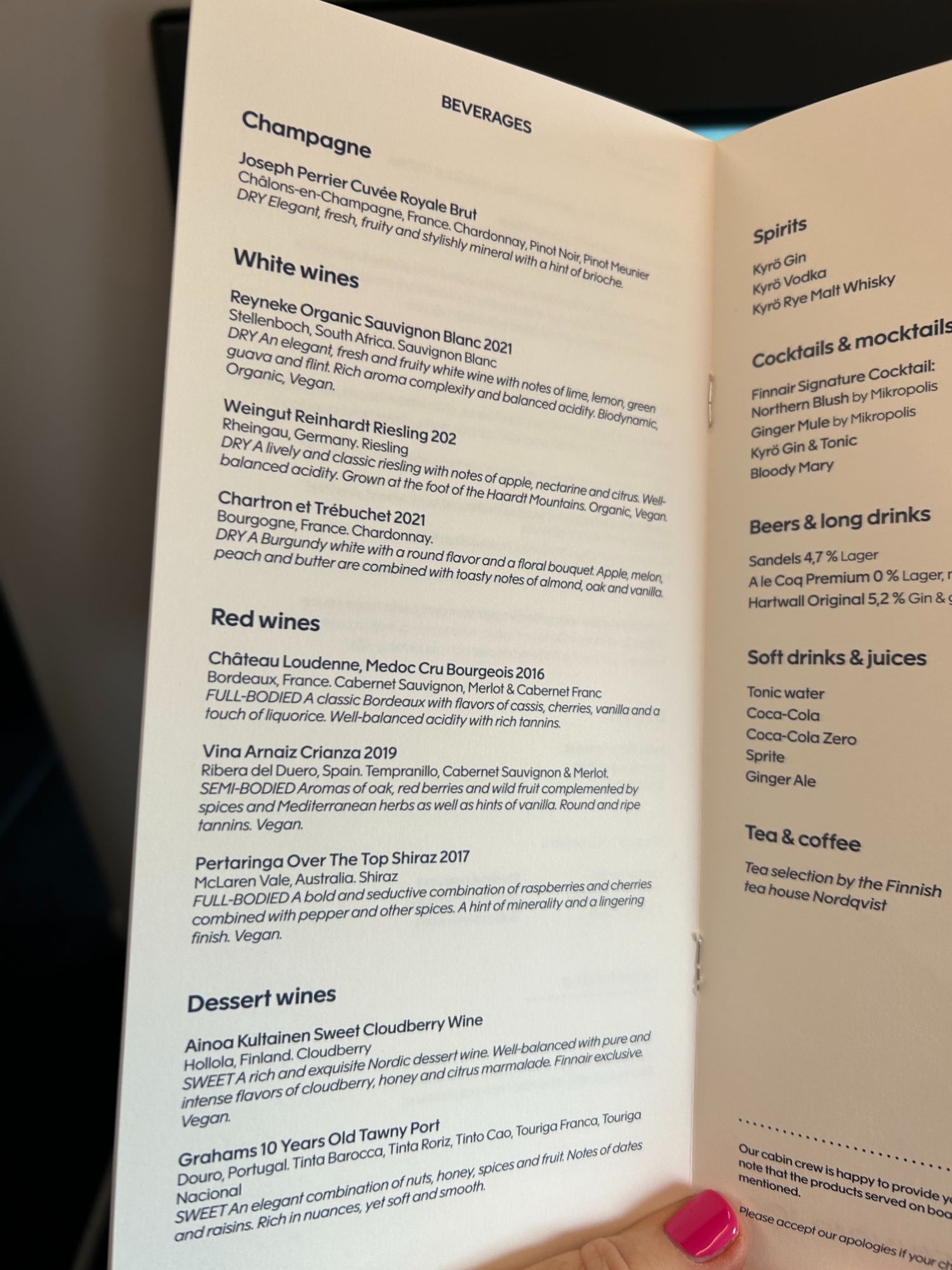 The seat had loads of legroom, although I do find Finnair short-haul A321/320 one of the harder seats for a longer flight. I did not drink alcohol on the flight, so stuck to water and my favourite blueberry juice, along with a coke zero. You get the lovely Iitala glasses on short haul. They no longer serve champagne on short haul but instead, a sparkling wine which was actually better than some of the bad “champagne” on other airlines.