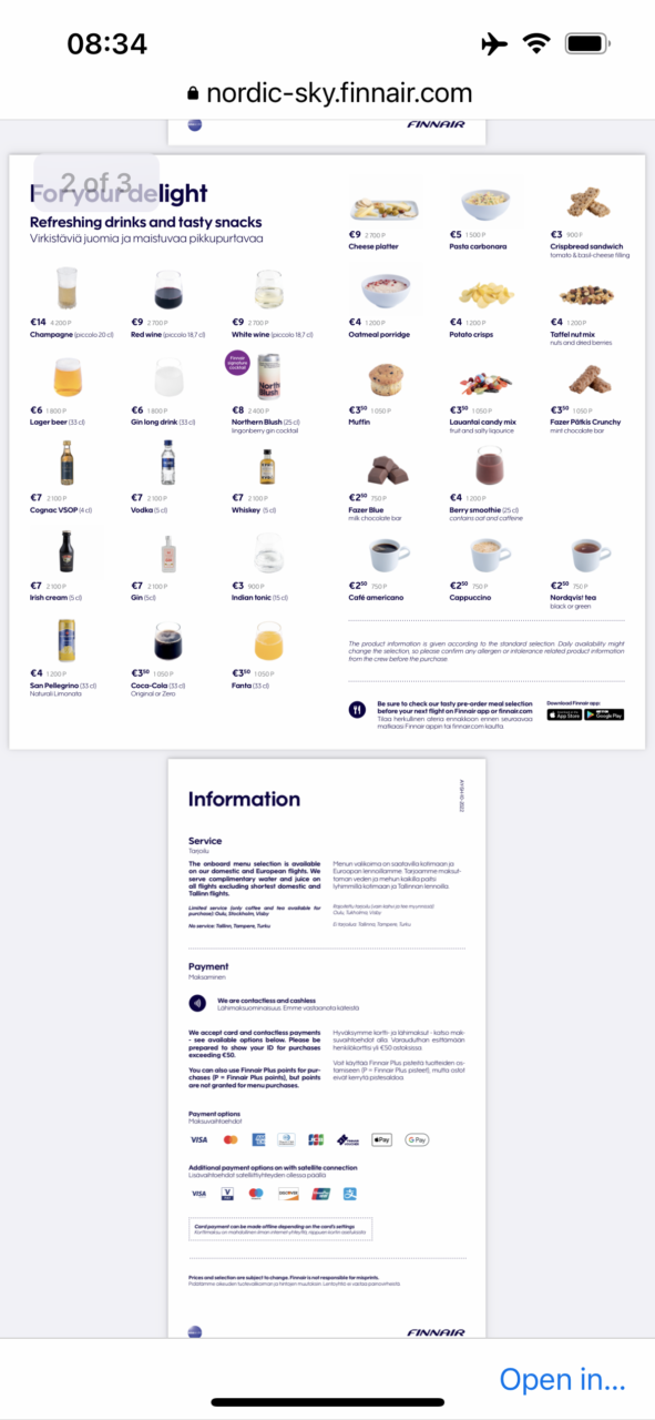 You get complimentary blueberry juice and/or water in economy. If you have never had the Finnair juice I recommend trying it. It’s just the right balance of sweetness to tart and makes a refreshing drink. The cabin crew were all friendly and helpful, which has been my experience on virtually all of my Finnair flights. I noticed that there were paper cups which is much better than plastic in terms of sustainability, something that Finnair are very focused on.