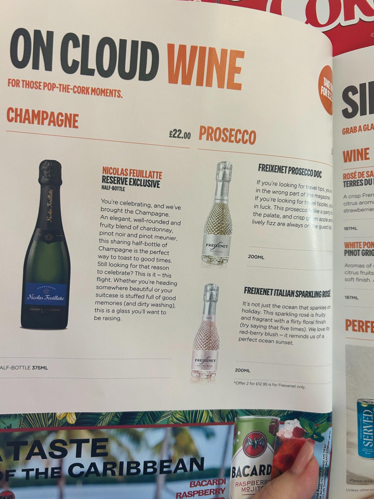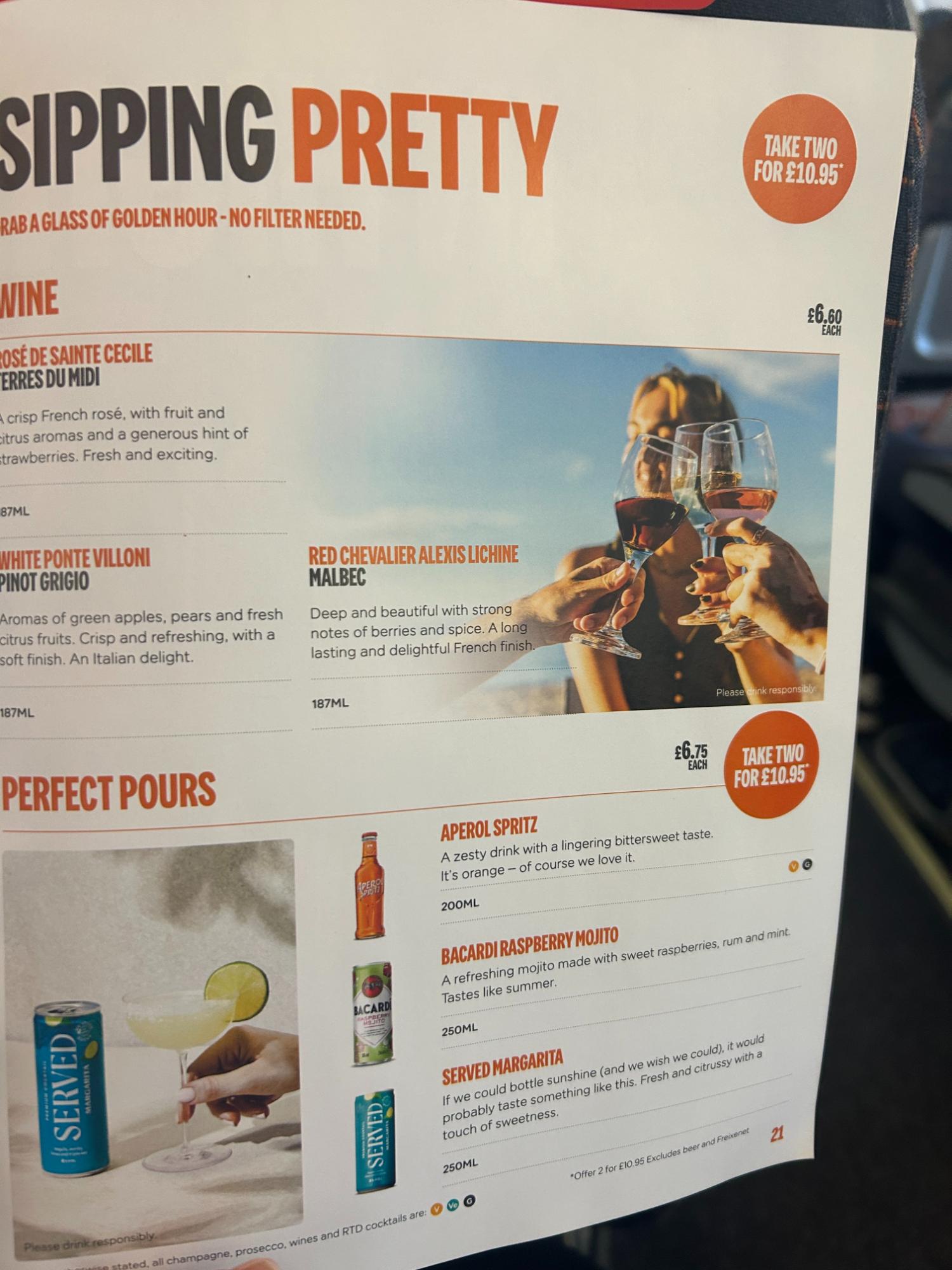 On BA you get a very small snack and a small bottle or cup of water. Often, the snack is something sweet, which I usually don’t want. So really, the offering in economy makes little difference to me on BA. I do like that you can pre-order with BA, and then you get served first. EasyJet don’t offer pre-order on the routes I fly, but you can get a £10 voucher for £8 from Gatwick.