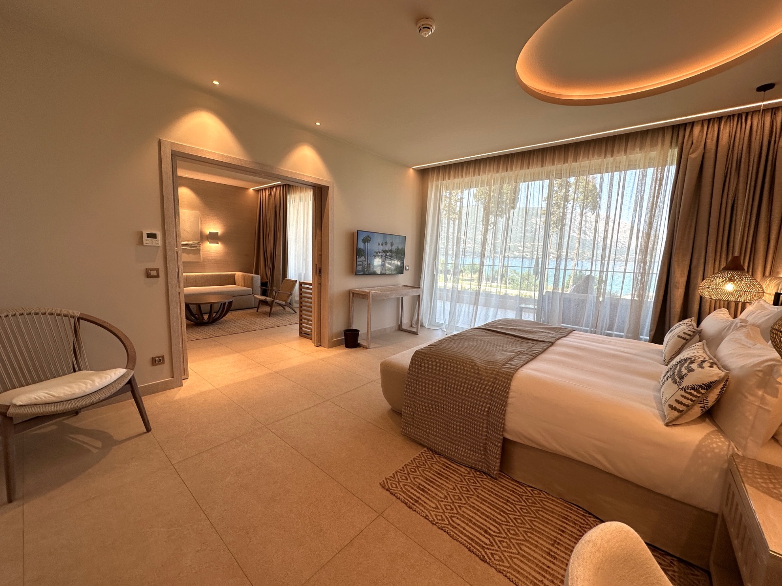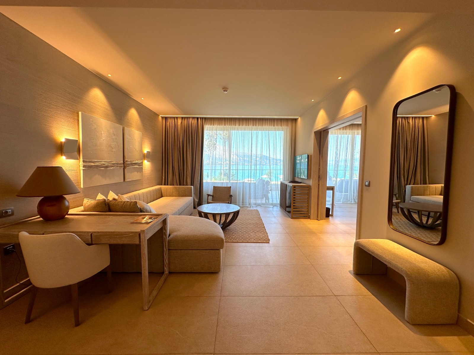 We stayed in a Deluxe One Bedroom Bungalow Suite with Balcony and Sea View. The room is really bright and spacious. You enter into a living area with a large ‘L’ shaped sofa, armchair, desk, wardrobes and a mini bar area. One of the many benefits of staying at an ikos is that you can request to have your drink of choice to be waiting for you when you check in. We are dark rum drinkers so requested a bottle of Diplomatico and Zacapa 23 which were indeed waiting for us. These aren’t cheap bottles and retail for £40 and £50 a bottle respectively so it’s a lovely treat. Through sliding doors is the bedroom which also has a desk, armchair and even more wardrobes with more hangers than we’ll ever need.