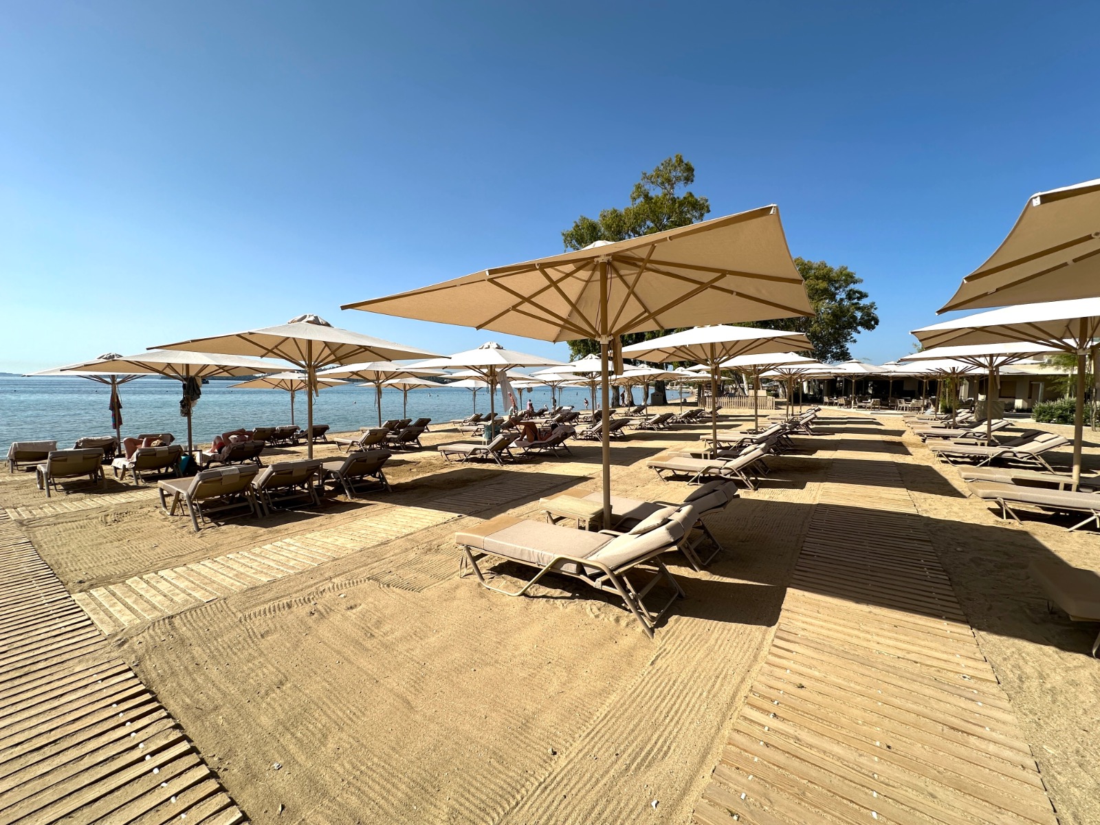 One thing that we do find slightly disappointing about ikos Odisia is the beach areas. We visited the Deluxe beach area a couple of times and had a look around the other areas, but the sand isn’t great, and it’s very pebbly to get into the sea. It may be that we have been spoilt with some beautiful beaches on our travels, but it just doesn’t feel like a comfortable place for us to enjoy. One other point to mention is that all beaches in Greece are public. Odisia seems to have a lot of locals using the beach right in front of the entire hotel which whilst it’s legal and absolutely fine with us, it does however lose any form of luxury or exclusiveness when quite literally dozens of people are setting up their own umbrellas and beach towels around you.