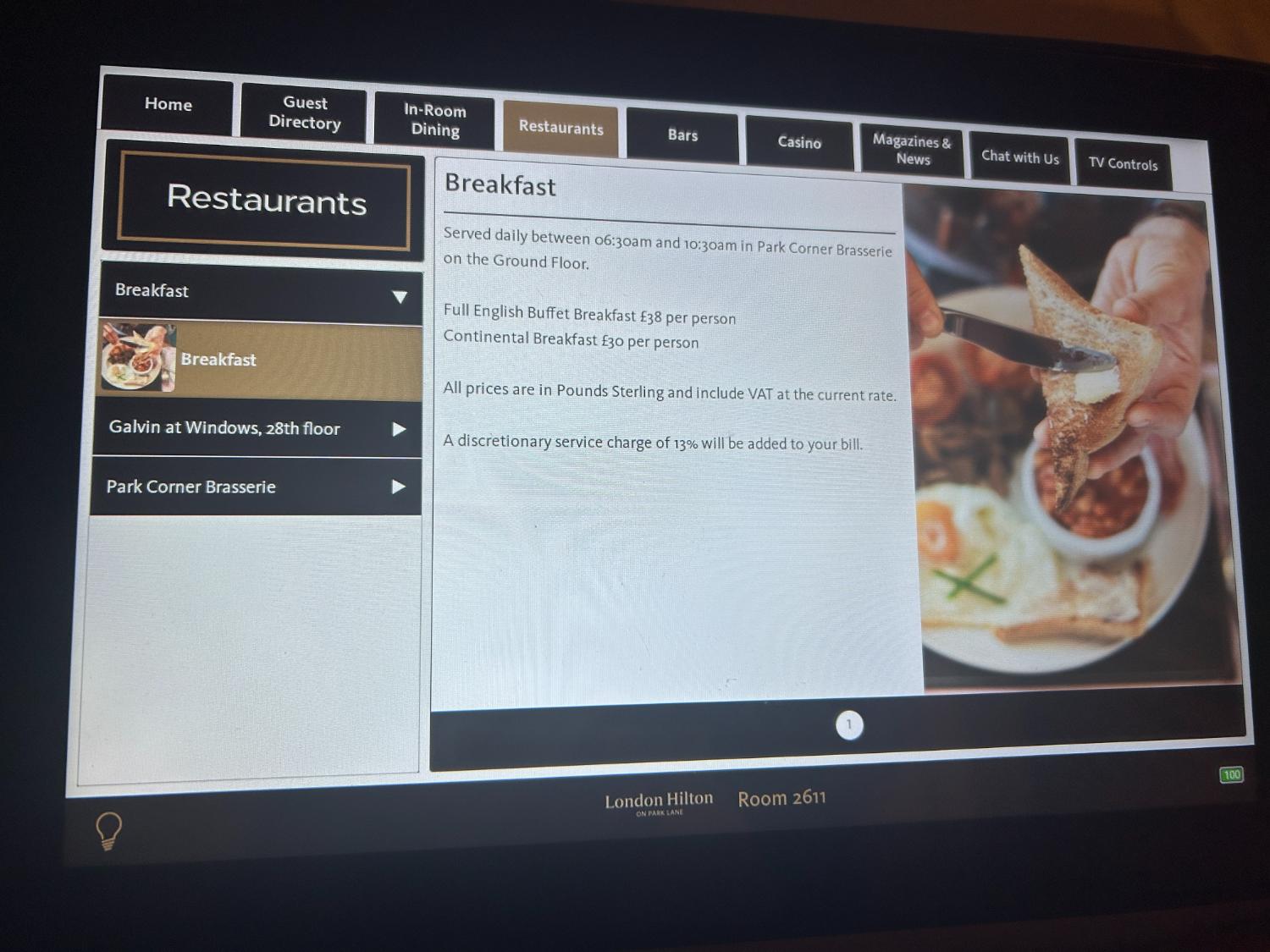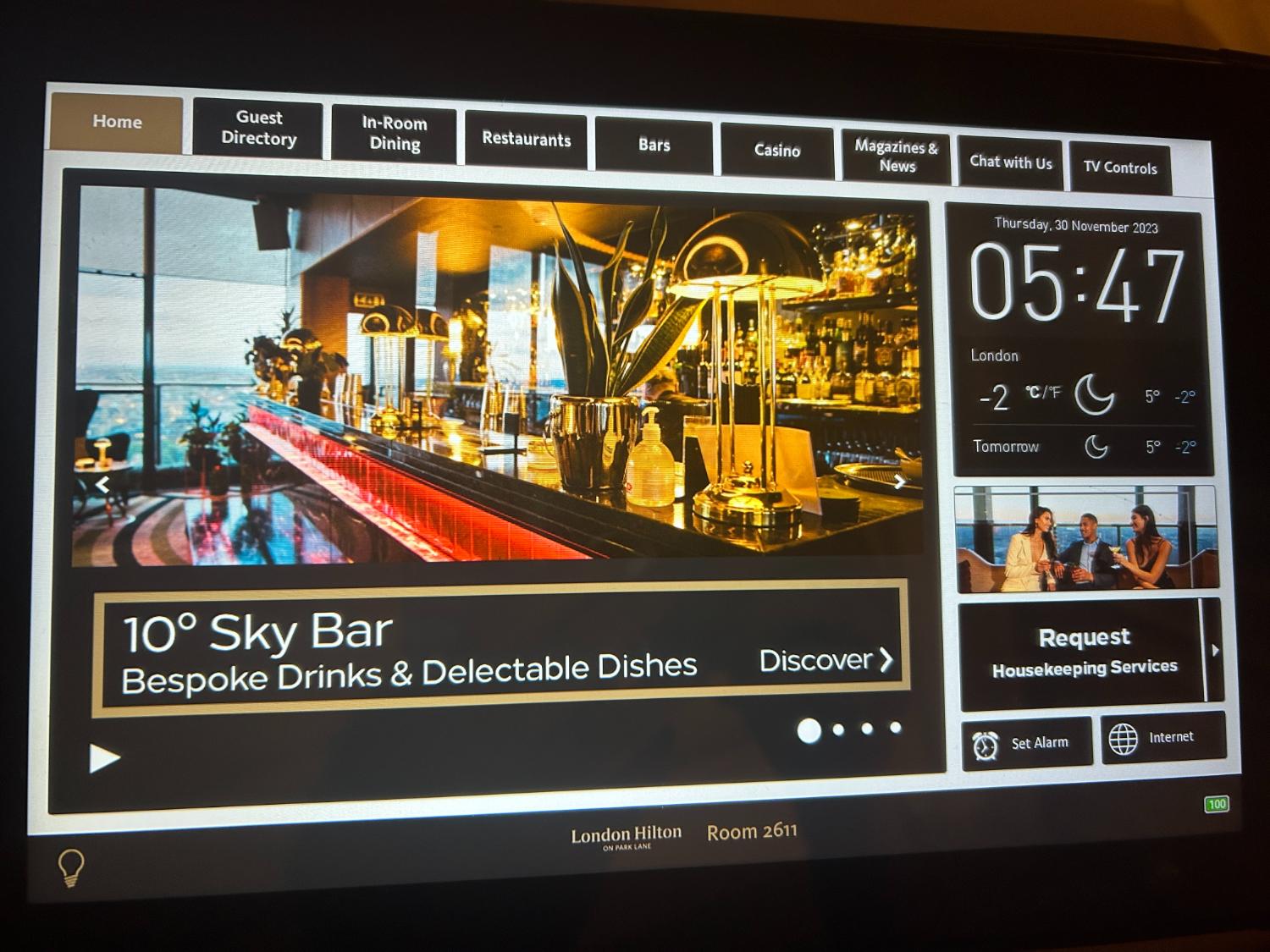 The rooms now have a tablet which enables you to look at information, order room service and also use Pressreader, which allows you to read from a selection of major publications. The tablet auto-dimmed, which was good as I find it disturbs me when they are bright at night. You can also use it to chat with the front desk, which was useful.