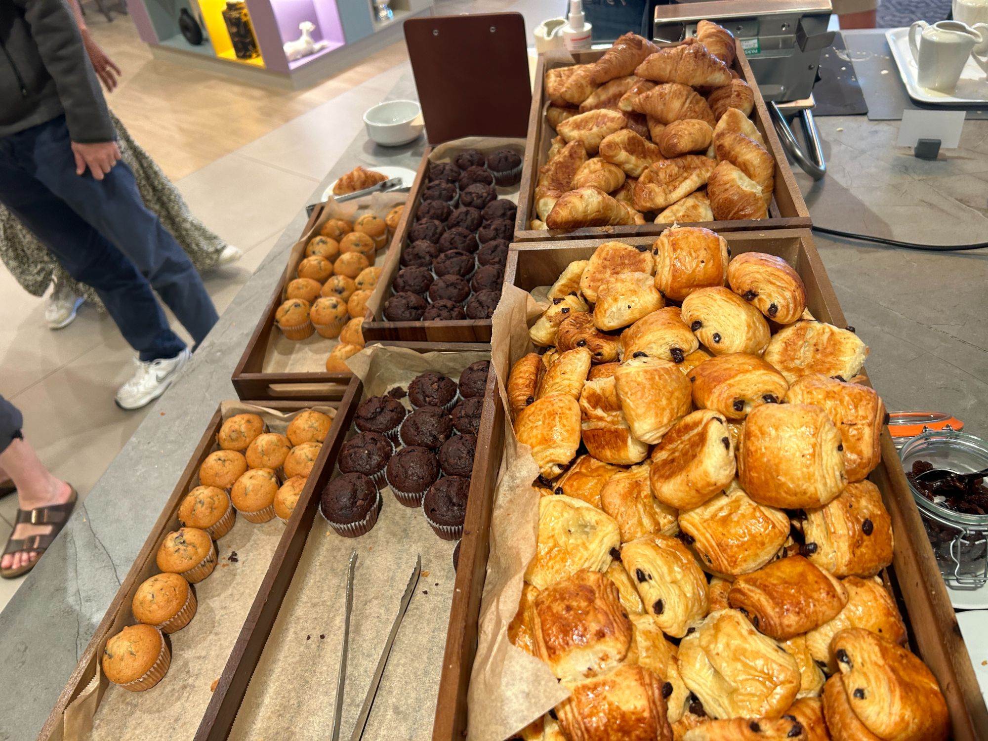 The cooked option had a lot more than expected with hash browns, mushrooms, scrambled egg, beans and bacon. For something sweeter, there were two types of croissants, muffins, a waffle maker with toppings and cereals. There were even marshmallows and smarties to put on top for the (big) kids!