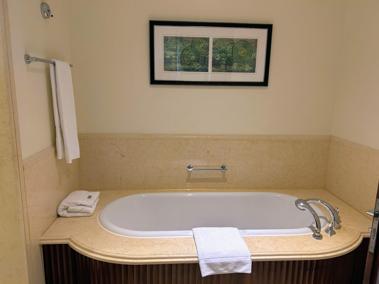 I found the bed extremely comfortable with high-quality bed linens, as I’d expect from the standard Heavenly Westin bed. I also noticed the room was very quiet. It was well equipped with bathrobes, slippers and plenty of free bottled water that was topped up regularly. There was a Nespresso machine for coffee as well.
