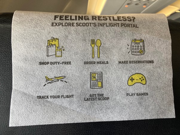 Scoot Flights sell a vast range of hot ready meals, including noodle pots, snacks, and alcoholic/non-alcoholic drinks. I wasn’t aware that you had to preorder hot food, so we did not buy anything on board.