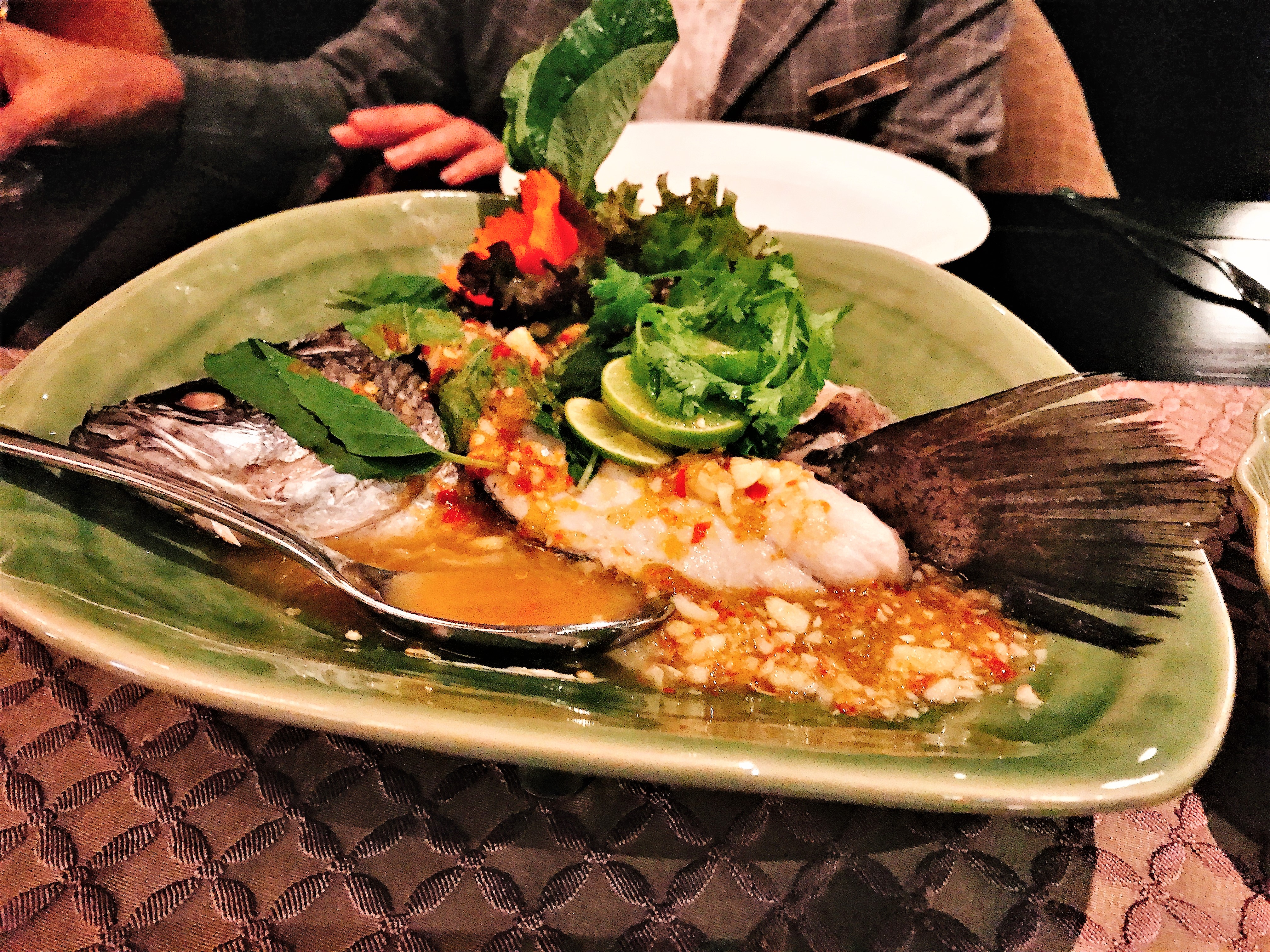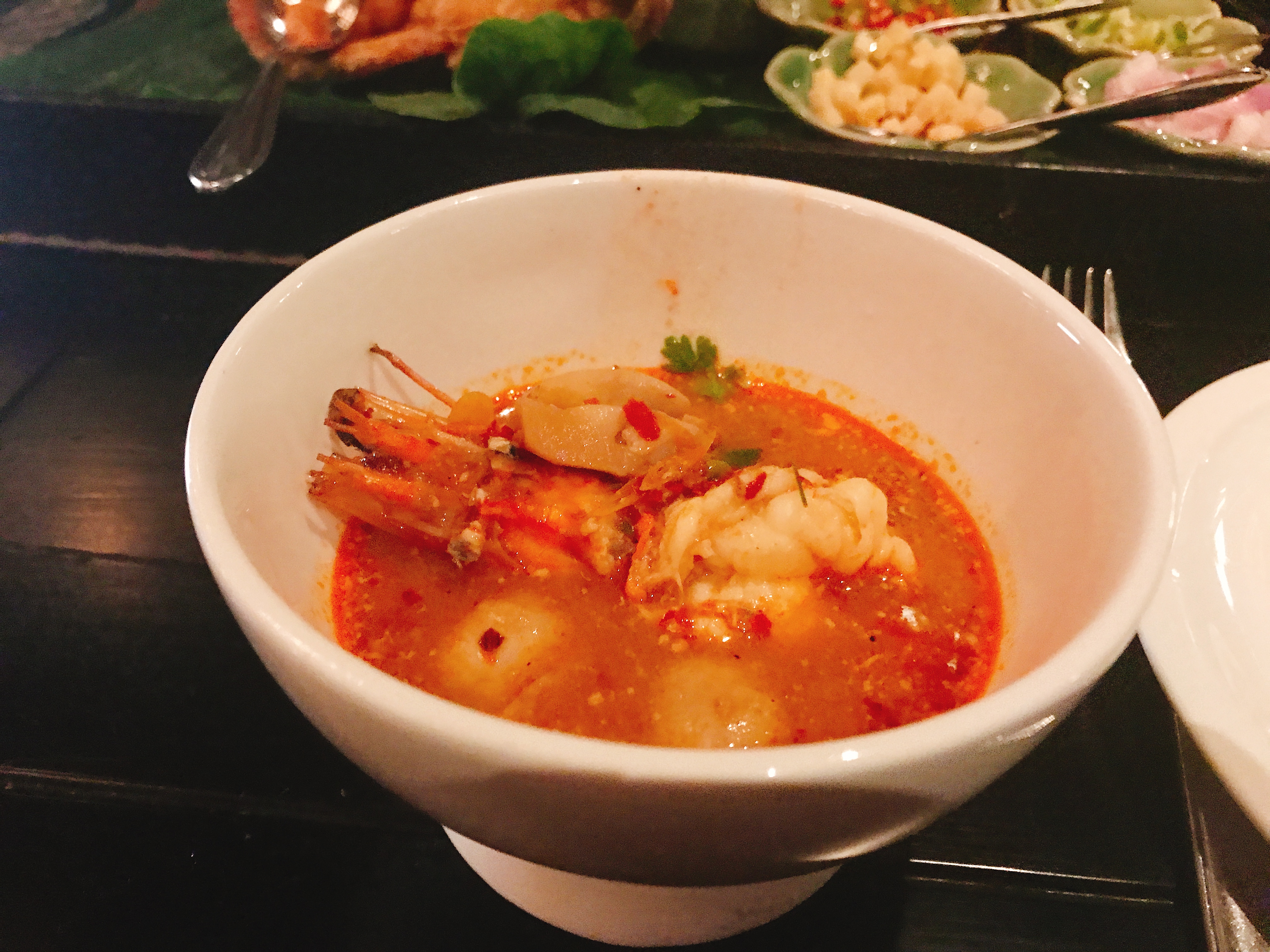 Next, I had Tom Yum soup which tasted slightly richer than normal, perhaps with a little coconut milk? It also had a juicy, sweet river prawn in it. The main course was something I actually tried to recreate at home last night since I enjoyed it so much. It was a steamed sea bass with a chilli and garlic sauce which was lovely and light but still full of flavour.