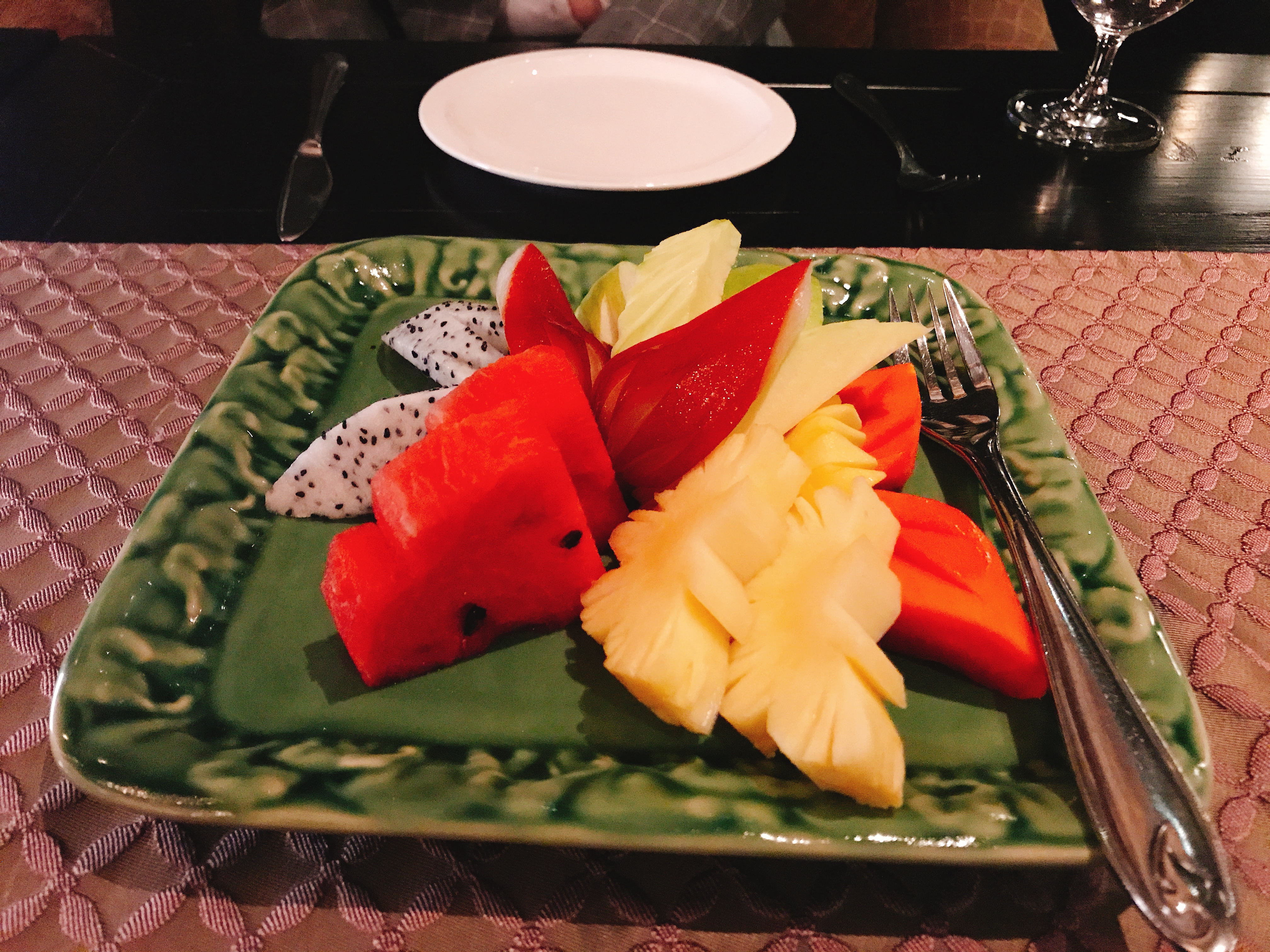 Waiting for some fresh fruit for dessert I enjoyed watching the serene Thai dancers. First of all there is a dance in the restaurant itself with a male and female dancer telling a story. Then outside the restaurant, a group of them performed which I really enjoyed as it was visually beautiful against the backdrop.
