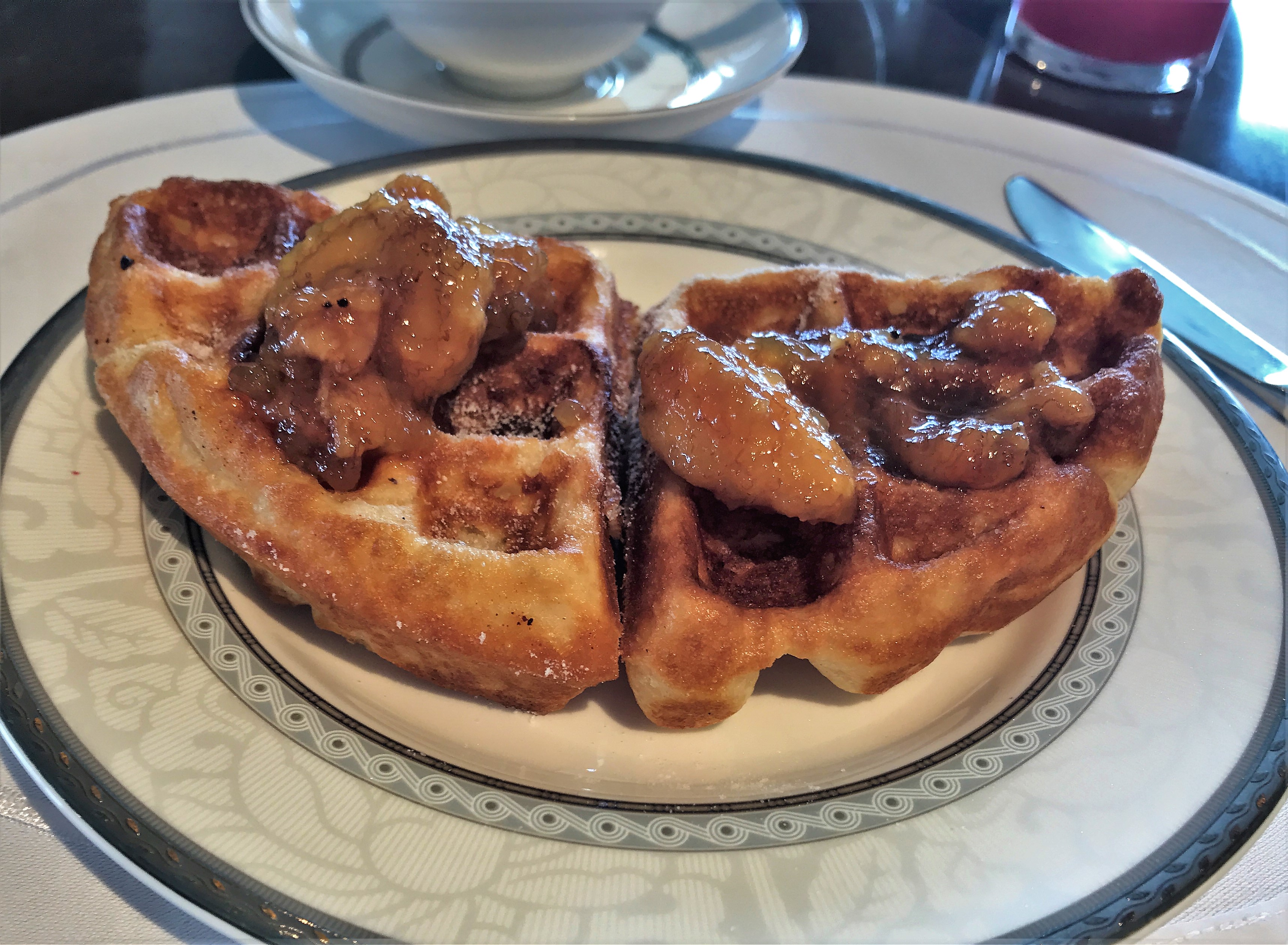 I tried the poached eggs with smoked salmon and the waffles with caramelized bananas. Both were excellent but the waffles were particularly delicious. Tea and coffee were also brought to your table in fine china. On the buffet, they had Asian and Western options including Dim Sum, Sushi, cheeses, meats, smoked salmon, salad, pastries, cereals, exotic fruit juices, western breakfast items liked baked beans and sausages and a rice or noodle dish. I liked that they had some unusual jams to go with your toast such as passion fruit or lychee.