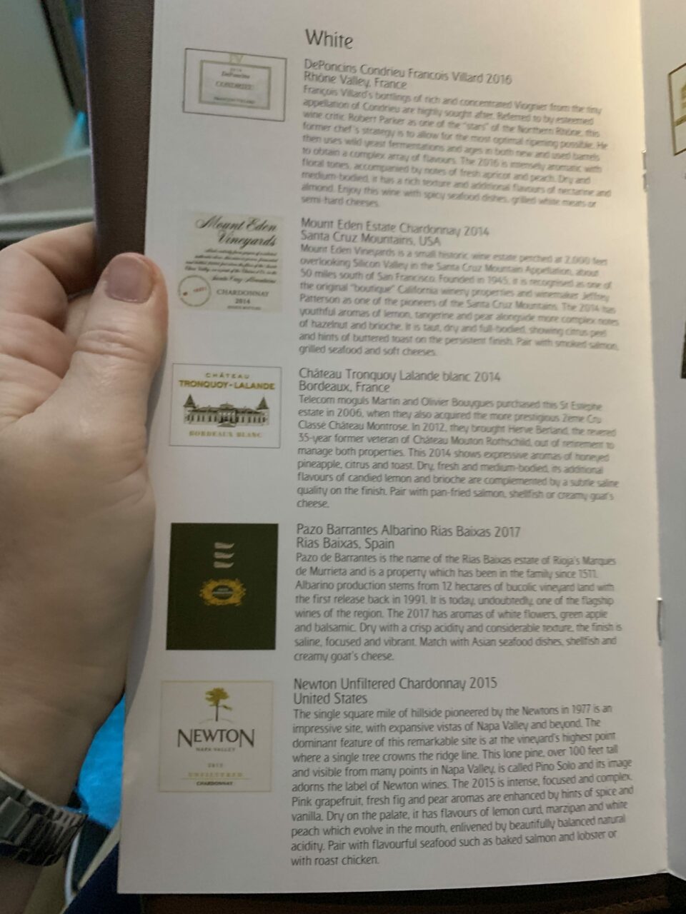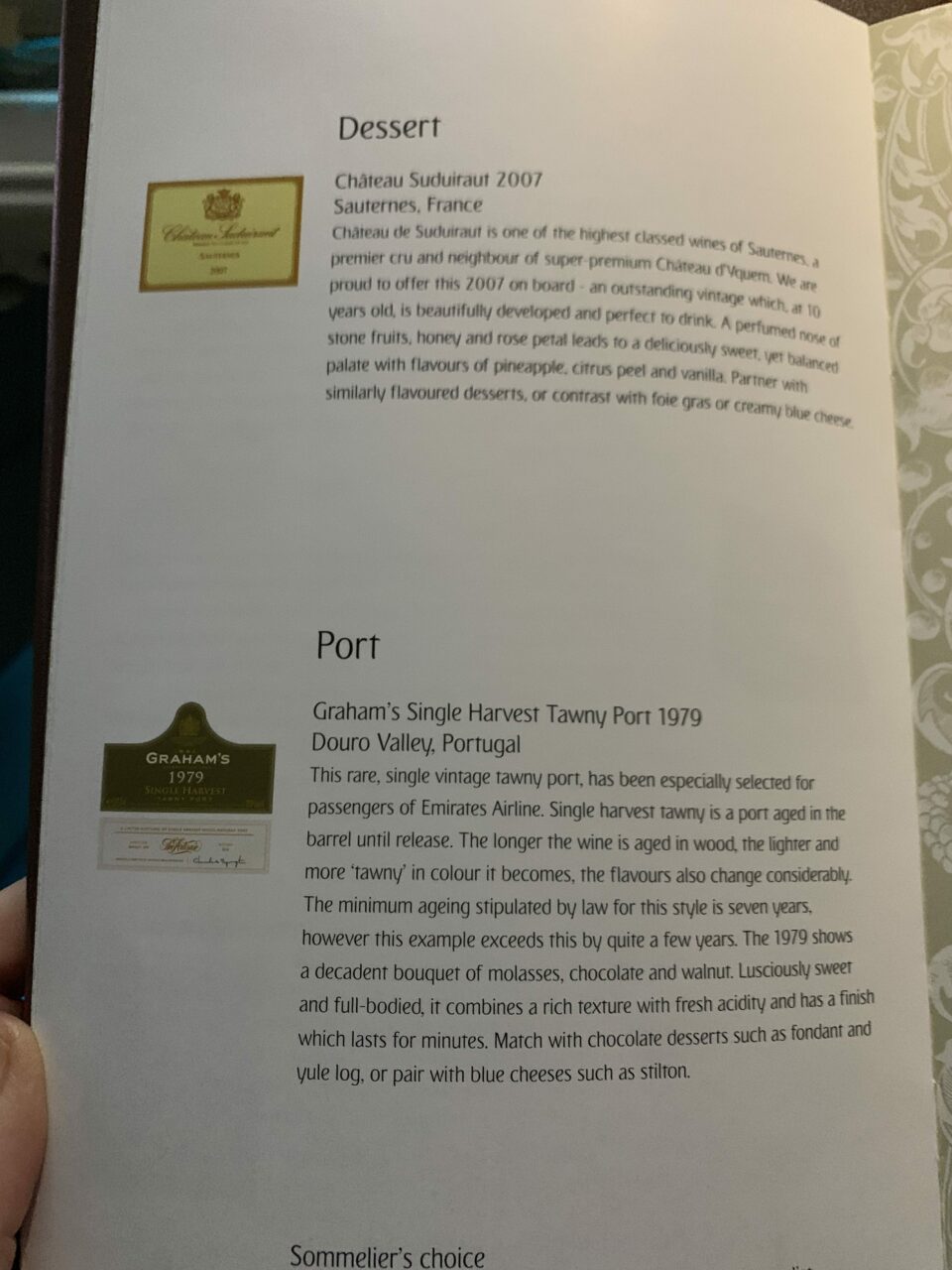 Emirates particularly shines for me in first with their very premium wines and spirits and generally good food too. You can eat whenever you wish on board. Here is the wine list: