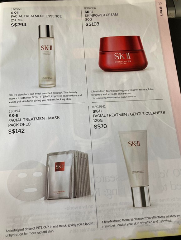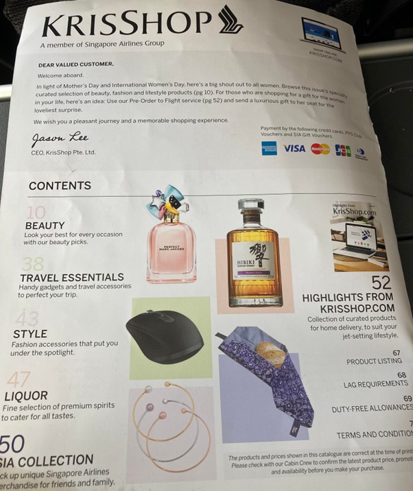 There were lots of things available to purchase on board, from mini cabin crew outfits to beauty products and alcohol. There was one in-flight announcement as well as information in a brochure and on the in-flight entertainment systems.