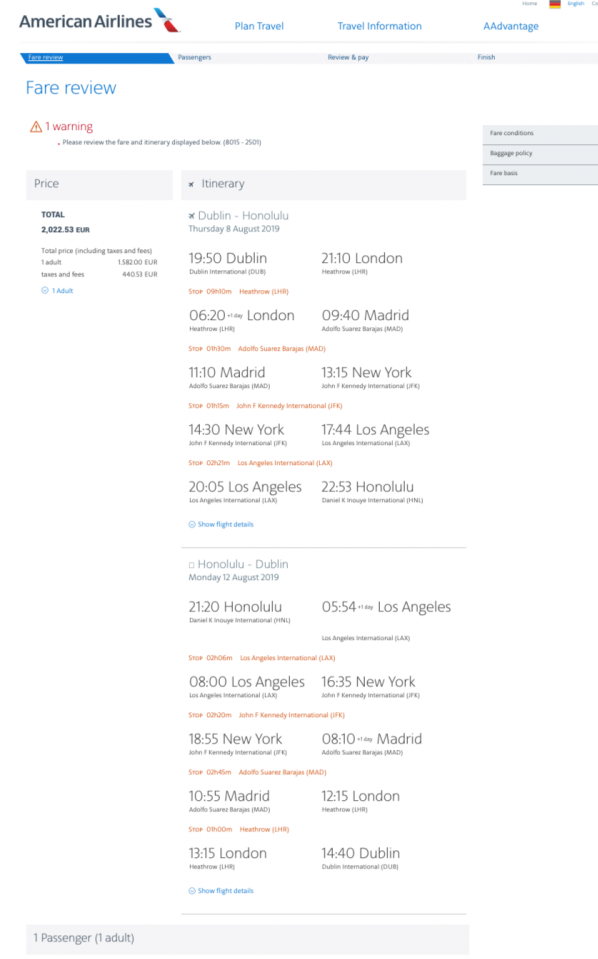 Michele already pointed out the nice Dublin to Honolulu fare earlier this week starting at £1660 – but what is this fare? What are the conditions? What can you do? The first thing to do is to identify a date where the fare is available – Google flights is often the easiest and quickest way to do this.