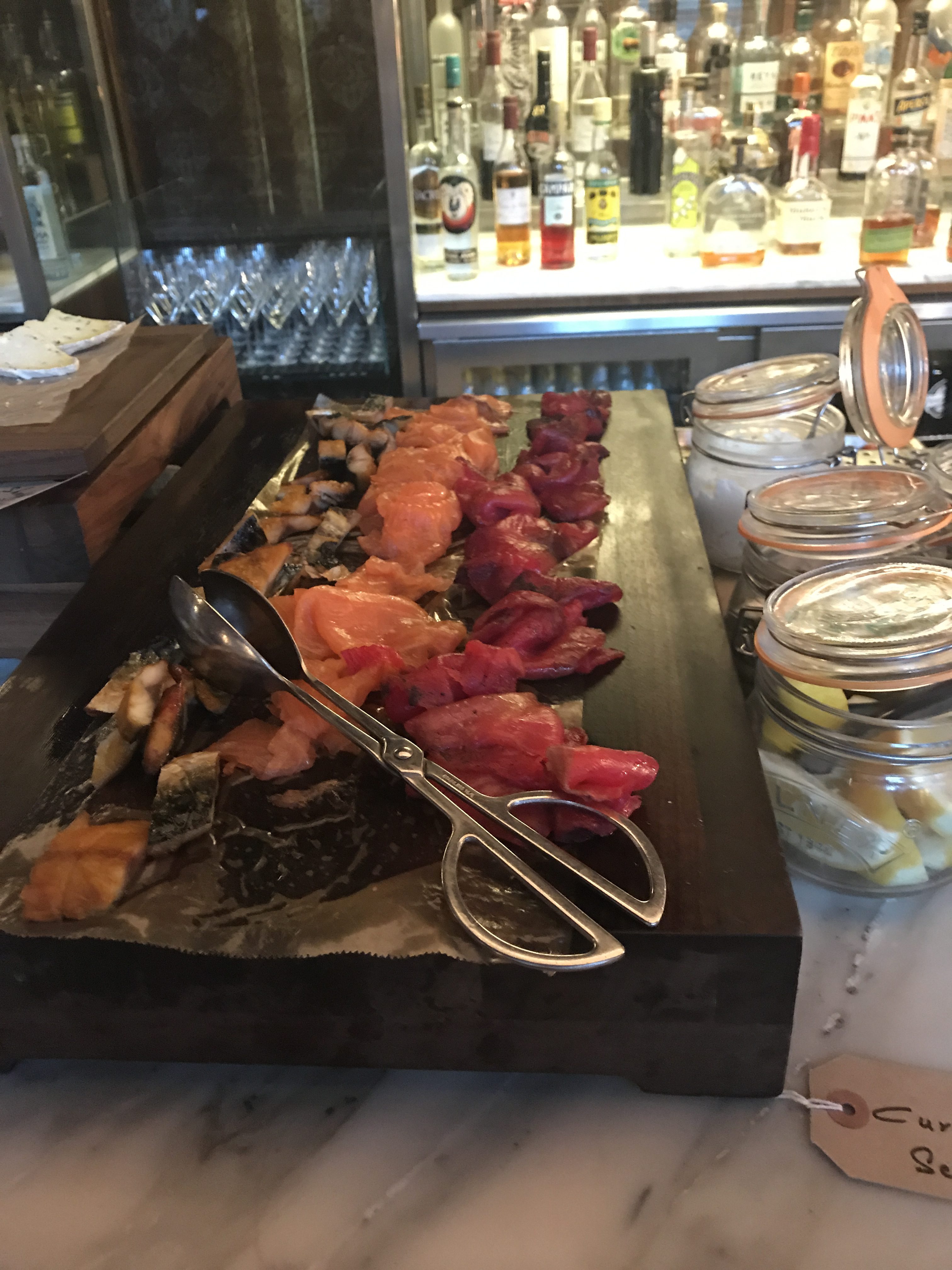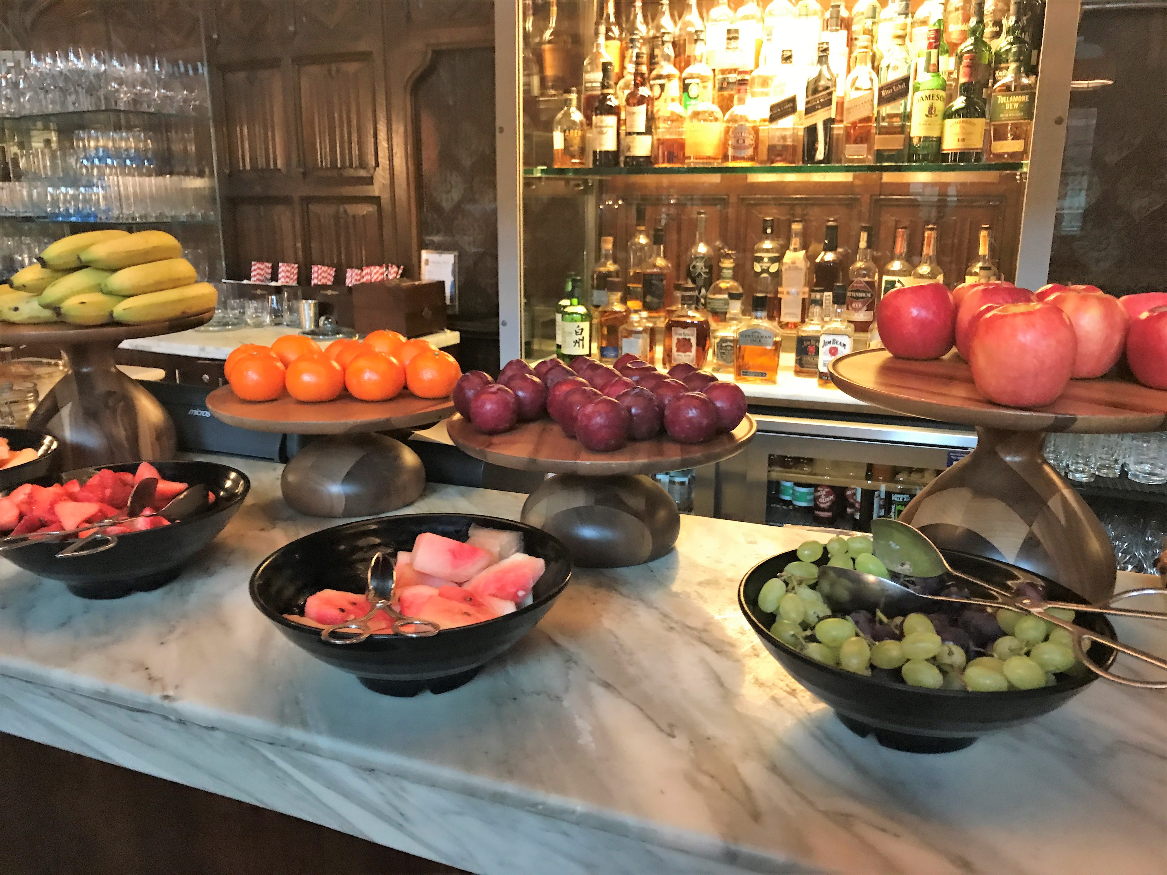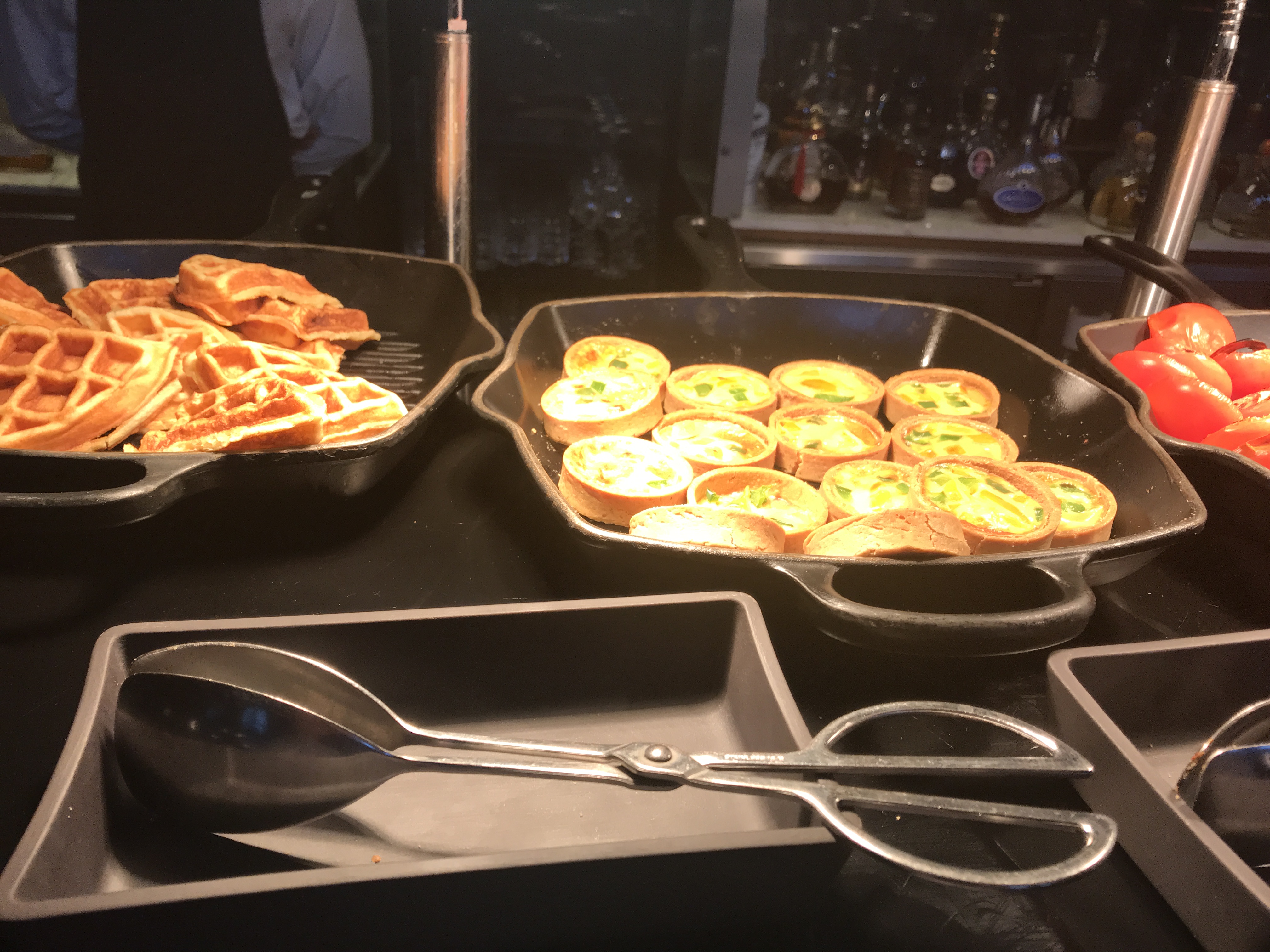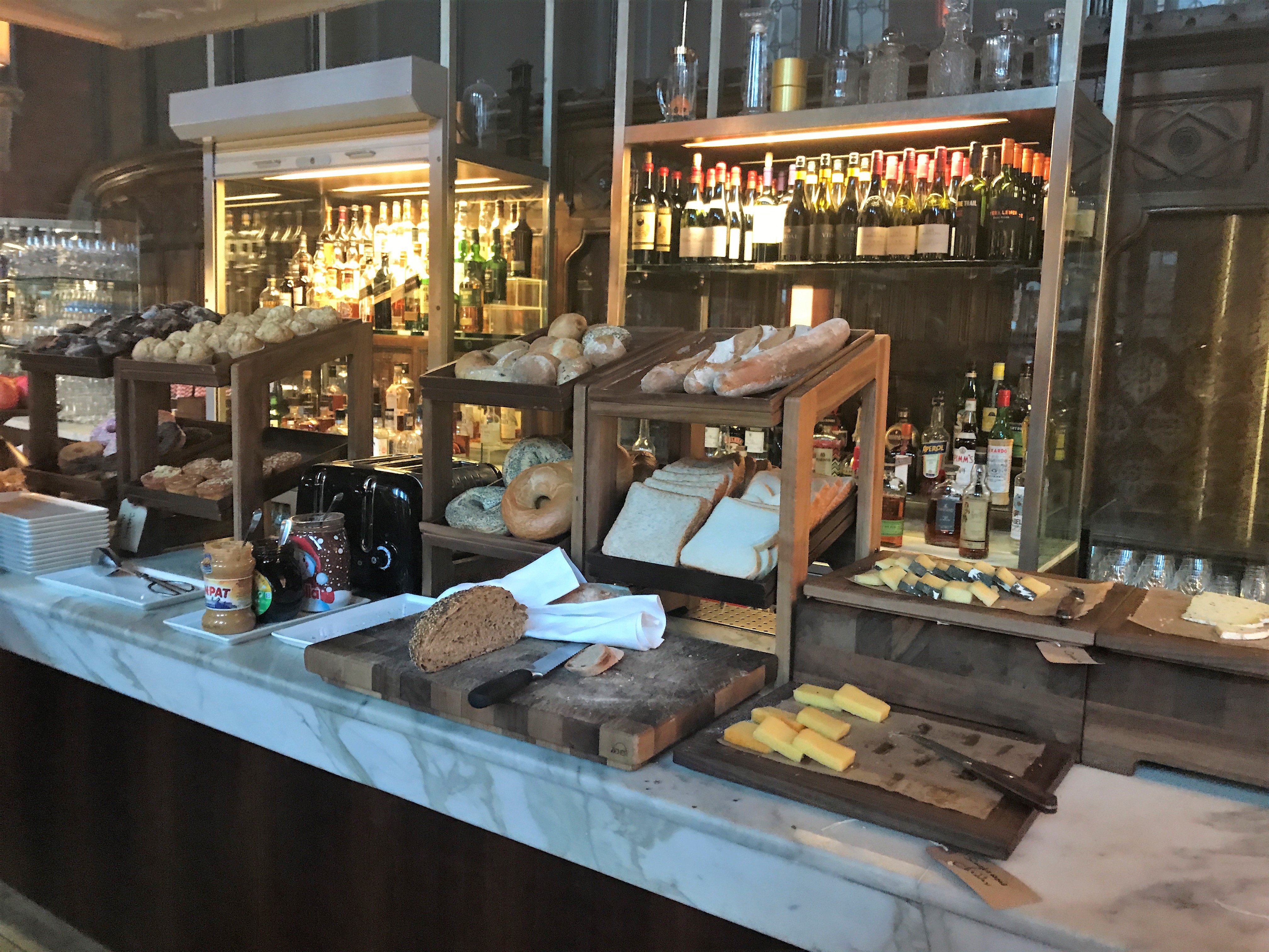 Breakfast the next day was free for me as a Marriott Gold and served in the Booking Office. The service was much improved at breakfast with my name used and an order for drinks taken promptly. It was tricky to get a second coffee though. I was very impressed with the selection of food available which included different types of salmon, lots of hot choices including mini quiches and waffles, and a nice selection of juices and waters. The only thing I could criticize was that the fresh fruit was a little basic.