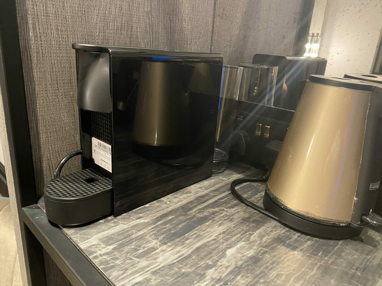 There was a decent Nespresso maker (with rather strangely 3 pods which seems stingy for a room for 2 people) and a Kettle. The TV was large and there were plenty of charging points by the bed and in the room.