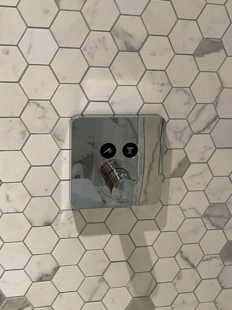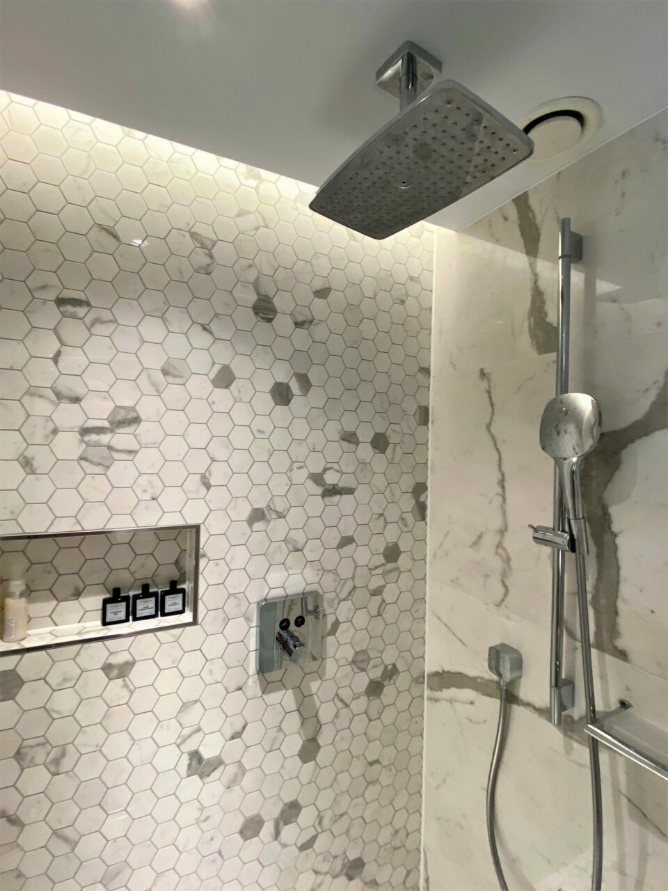 The shower was smaller but I liked the push-button controls and recessed shelf.